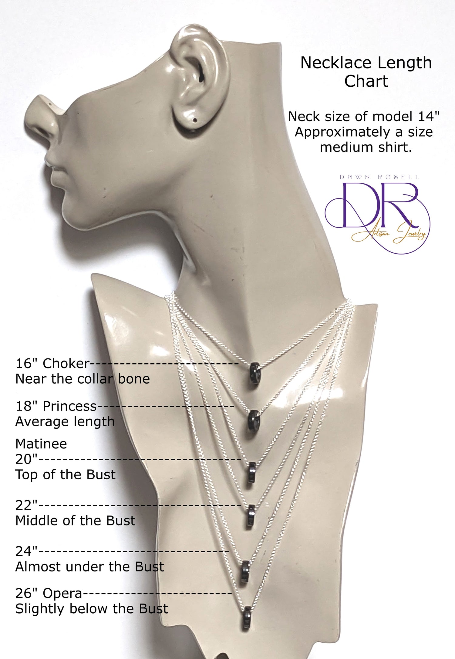 Use this chart to get an idea of where a piece may land and what type of neckline it will work with. For more on the perfect length necklace, check out my article which will be released on 12/21/22.