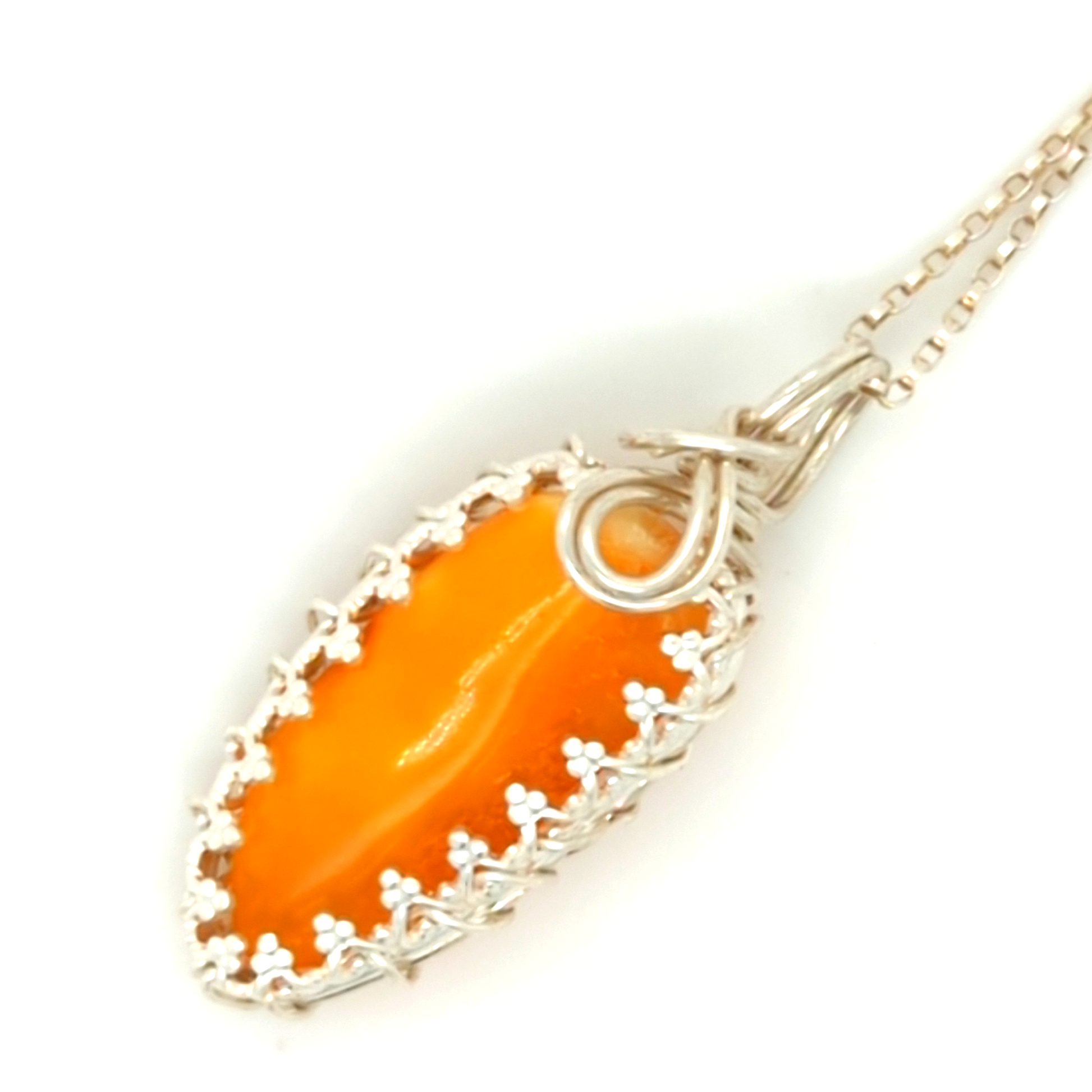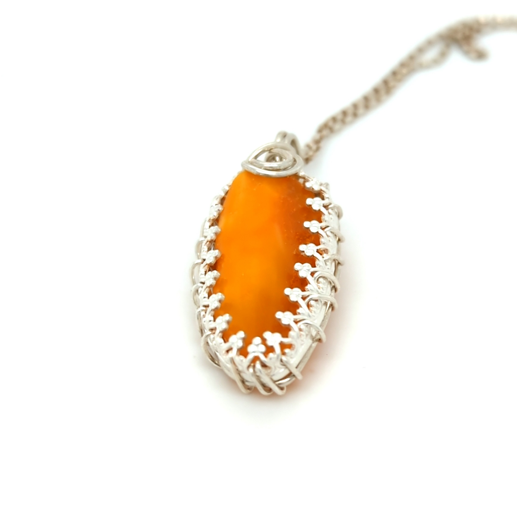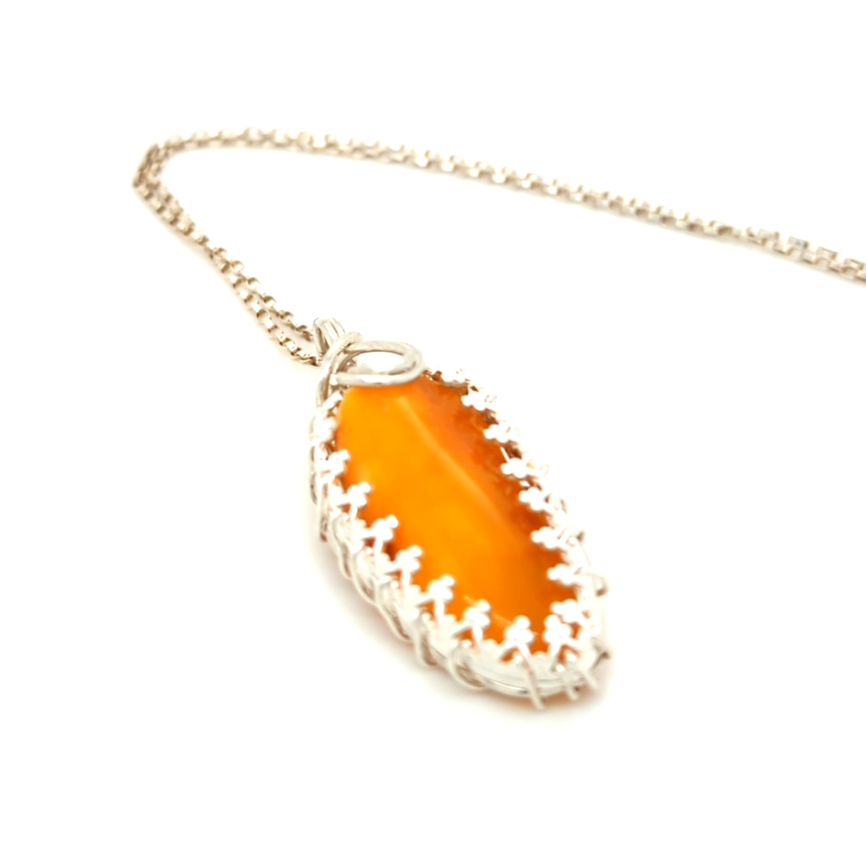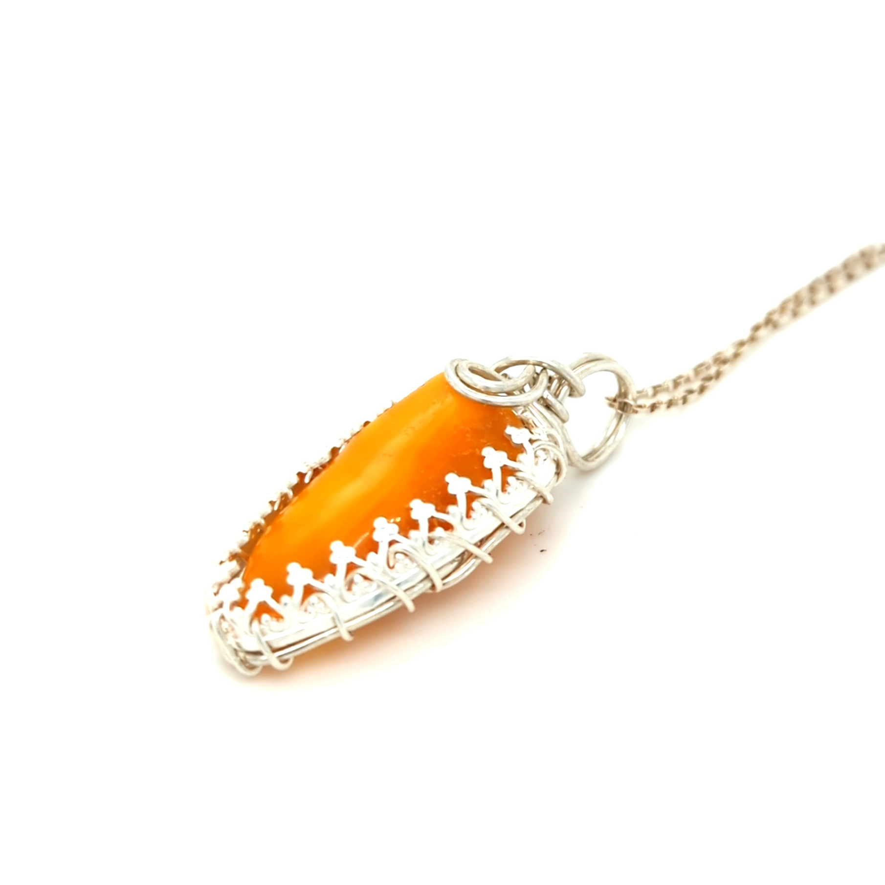 This handcrafted sterling silver pendant offers versatility with its reversible design, transforming from a classic setting to a wire wrap style. Adorned with a soft and creamy yellow gem, it adds a touch of elegance. Elevate your style with this unique amber pendant.