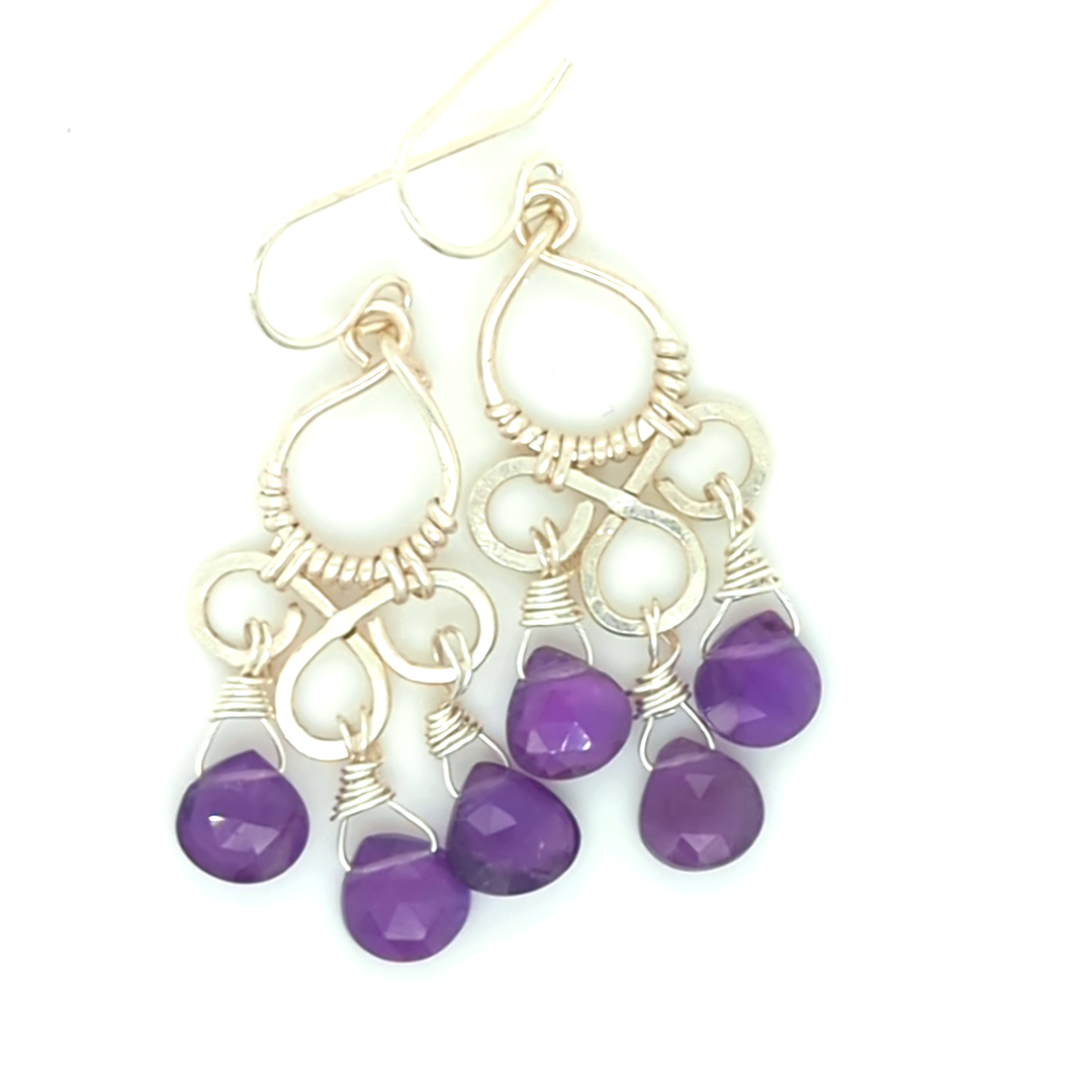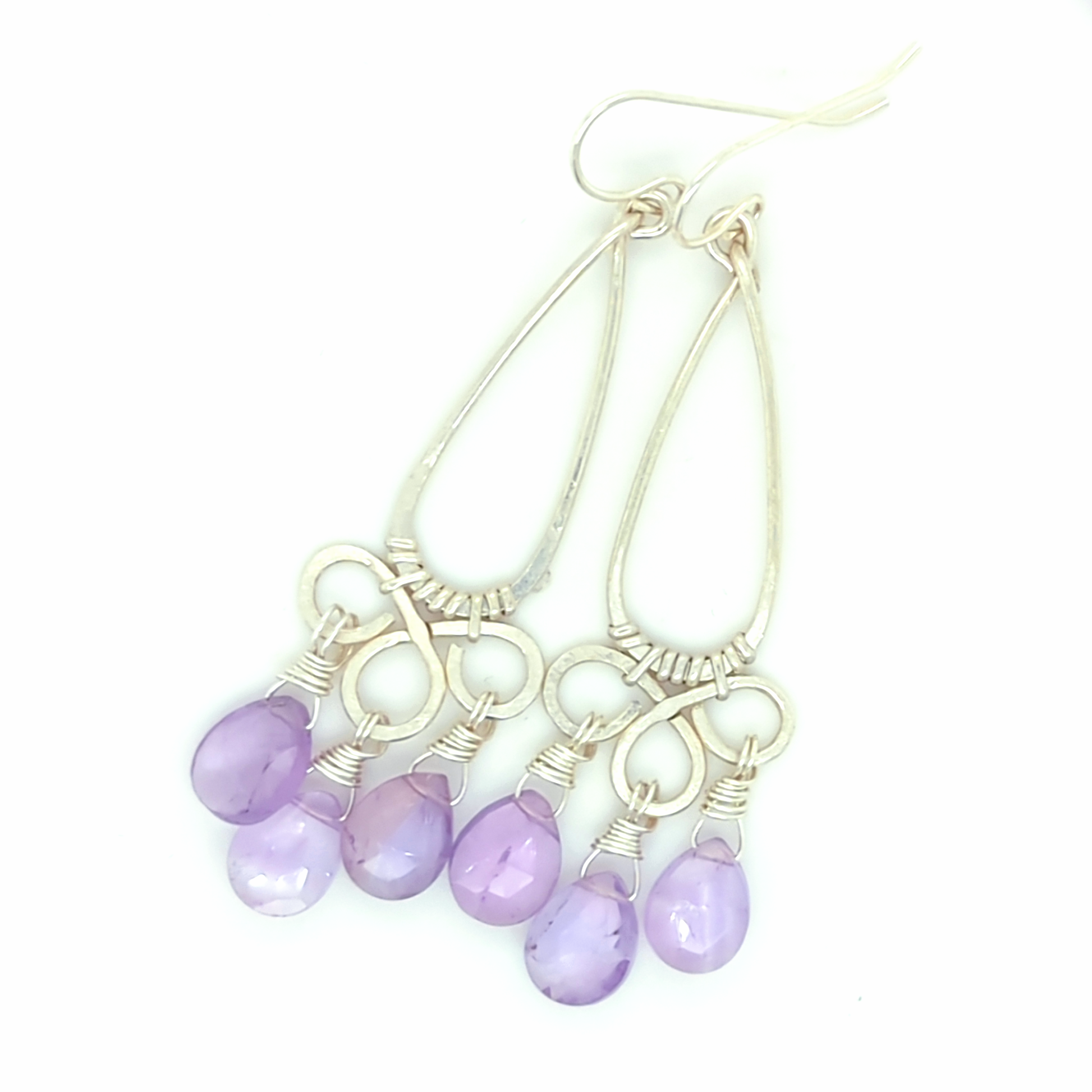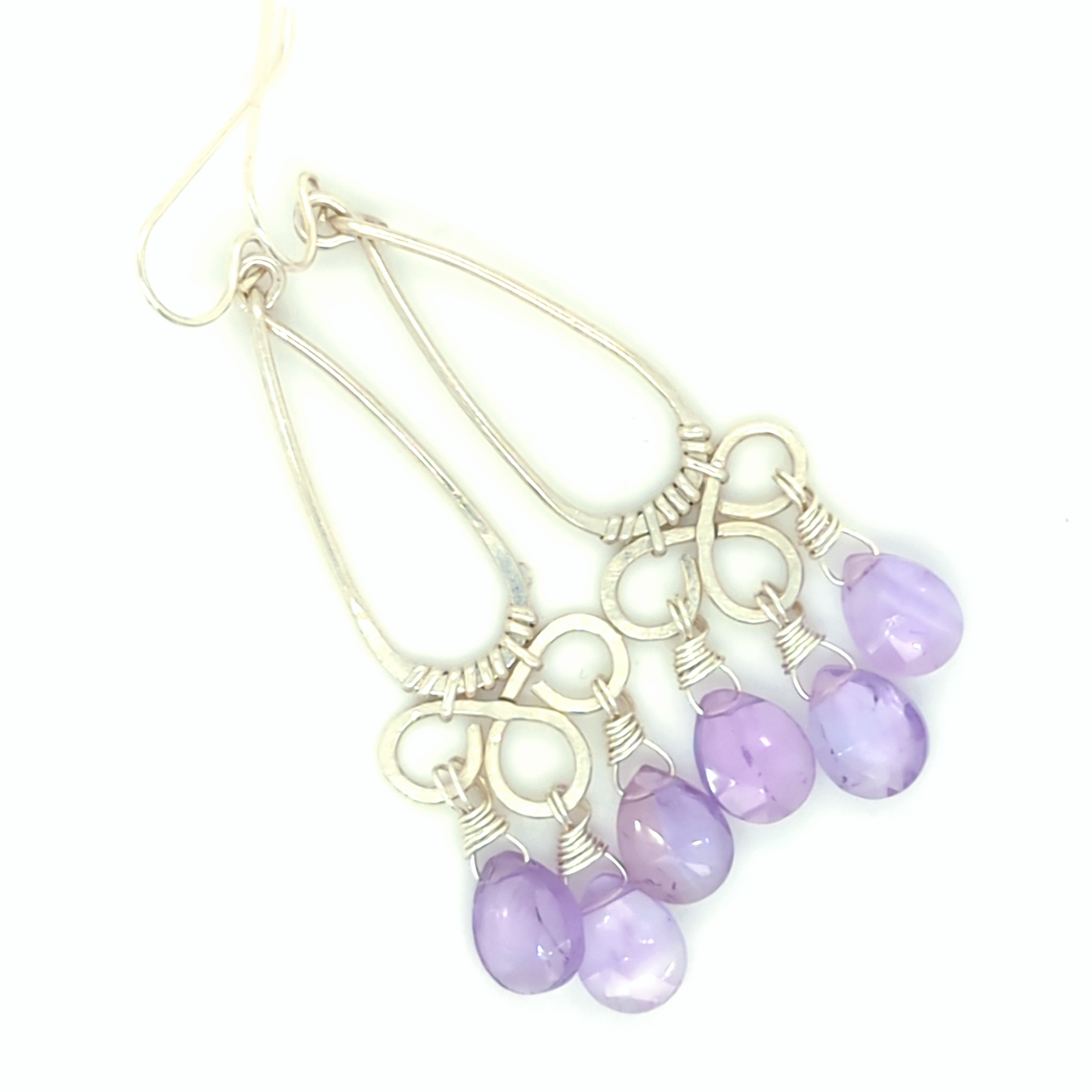 Illuminate your look with my Amethyst Chandelier Earrings. These elegant earrings feature either deep lavender or light purple faceted gemstone drops that dangle and swing from a sterling silver base, providing a touch of sparkle and shine. Elevate any outfit with this beautiful and versatile accessory.