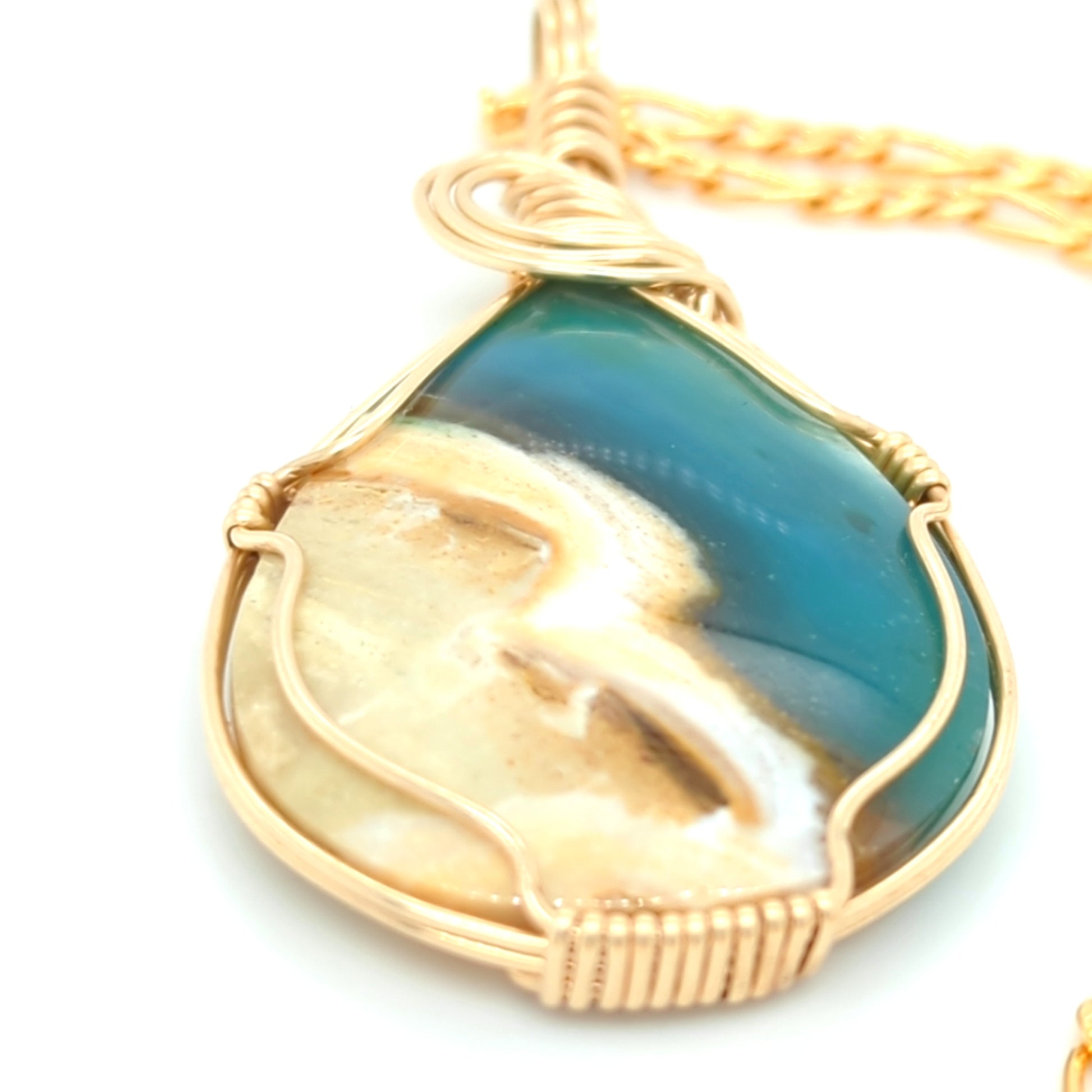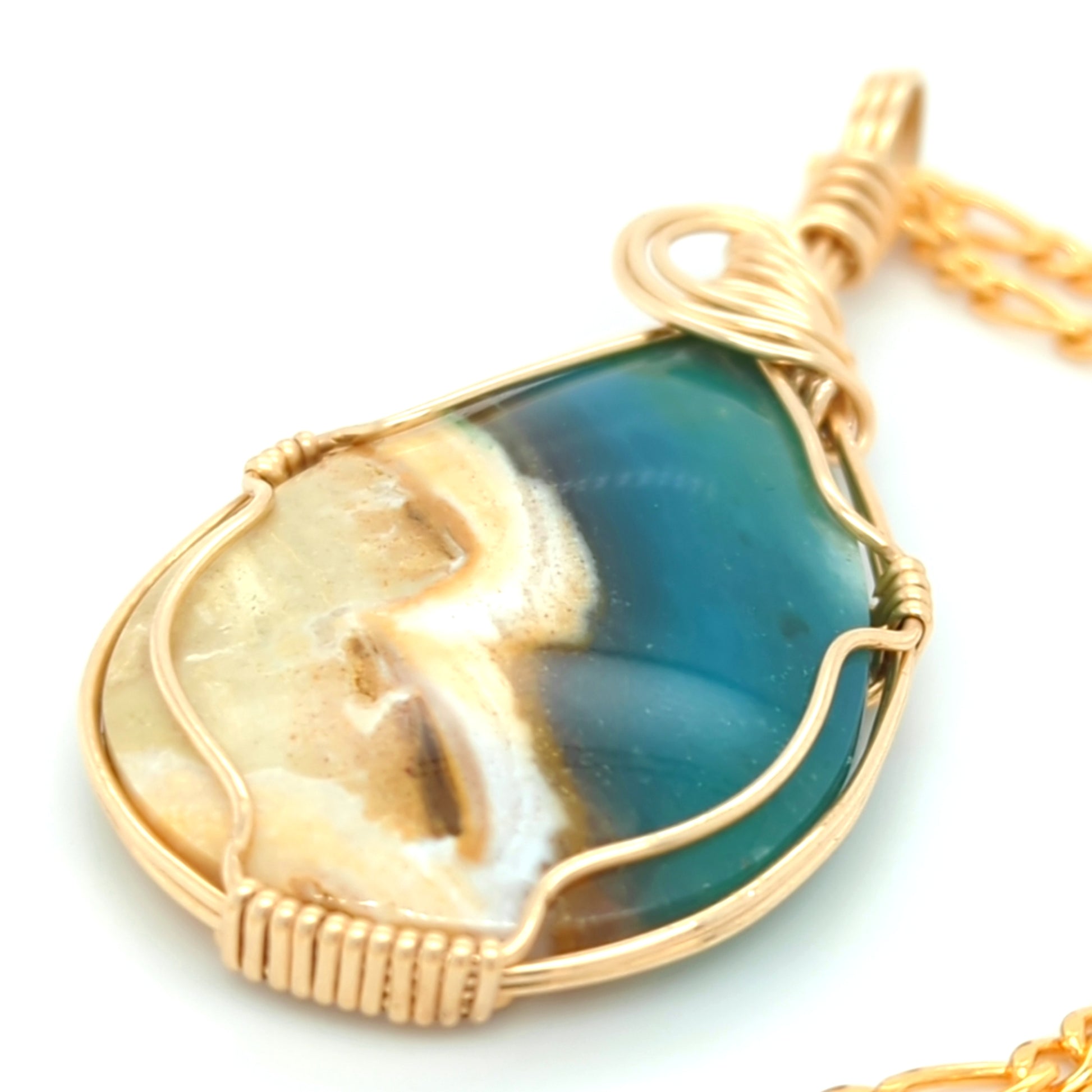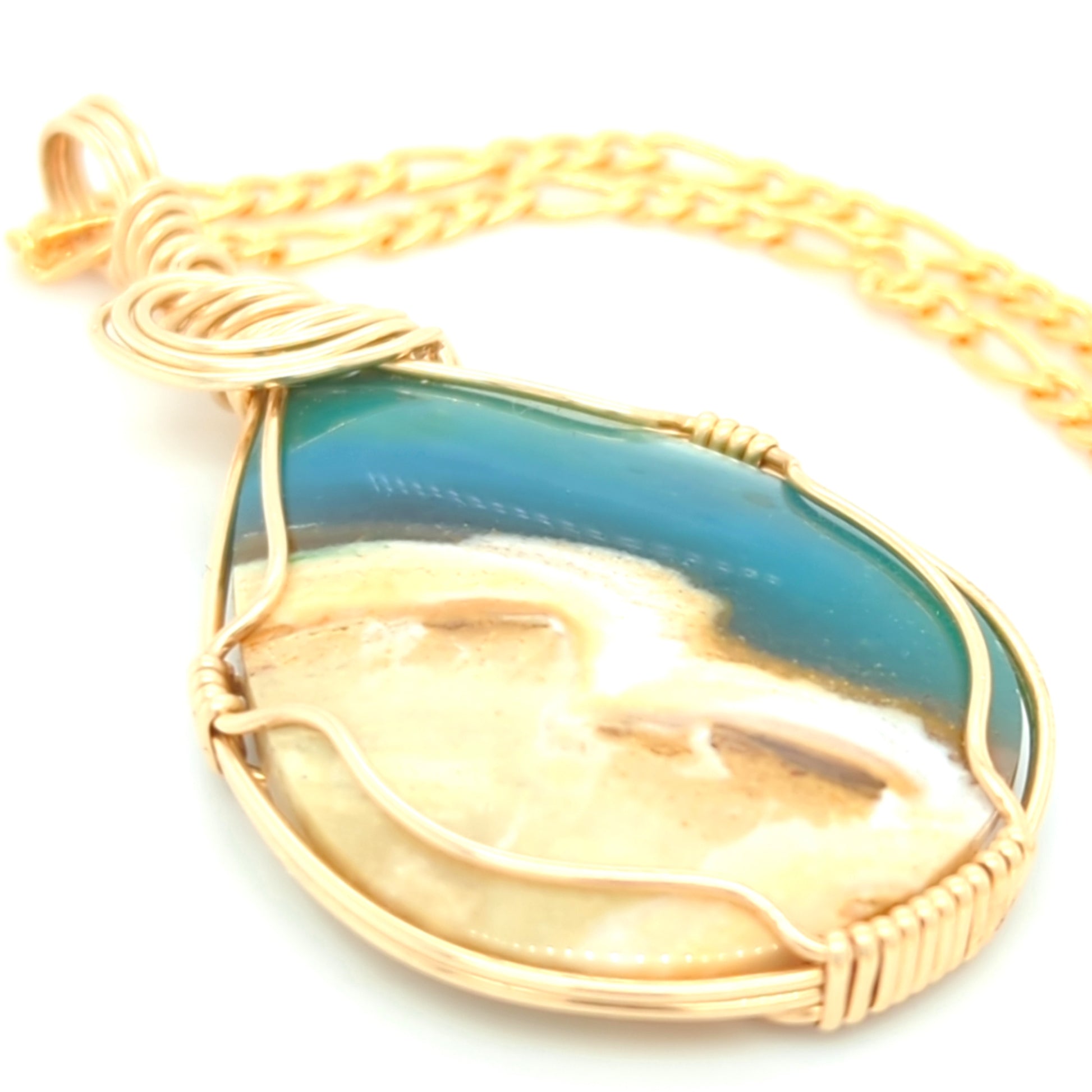 This Beach Opal Necklace features a large teardrop gemstone with a natural landscape shoreline design. The gorgeous handcrafted piece displays a cream sand and deep turquoise water, expertly wrapped in gold fill wire to let the gemstone be the focal point. . Hung on a thick, adjustable Figaro chain in 14kt Gold Fill that goes up to 18" length.