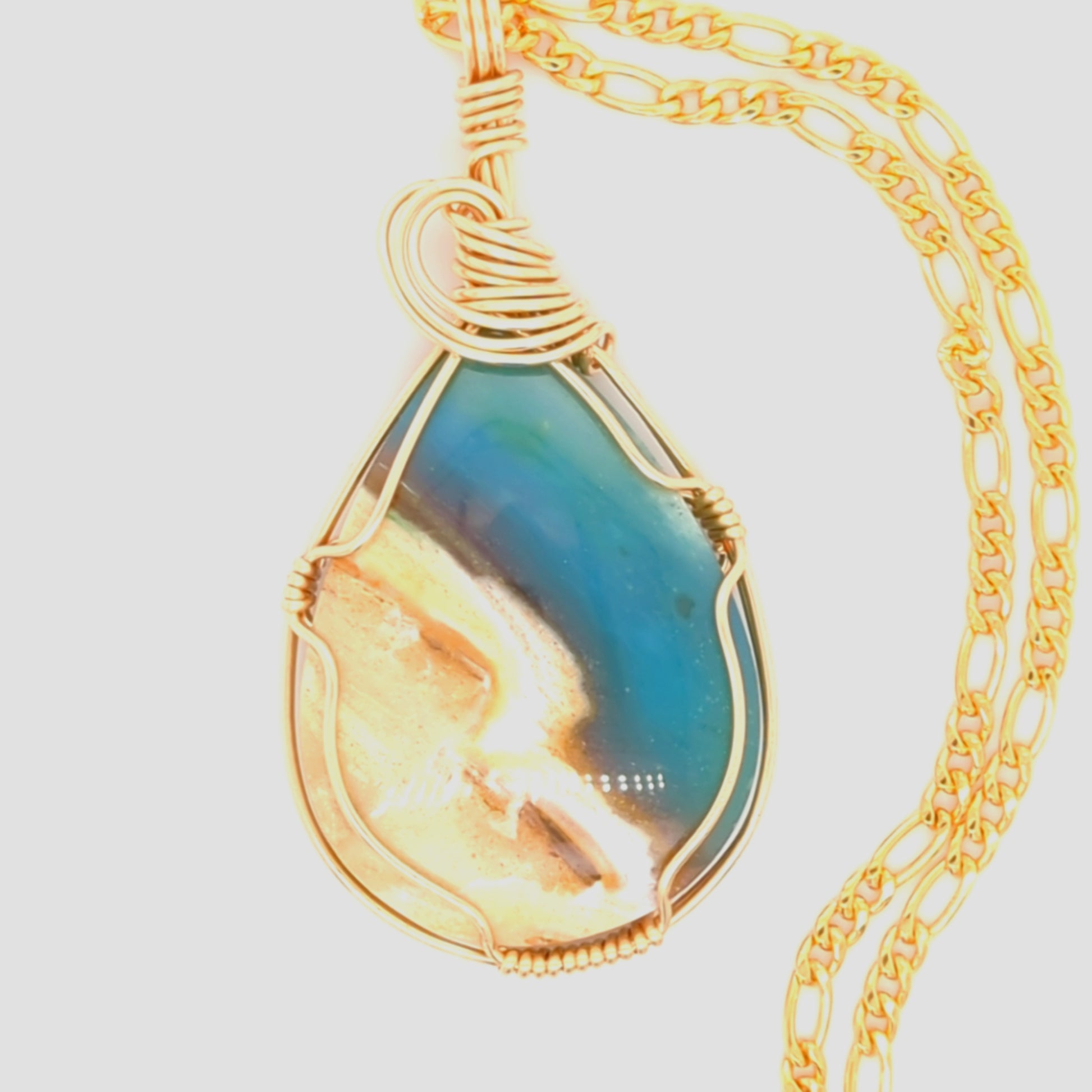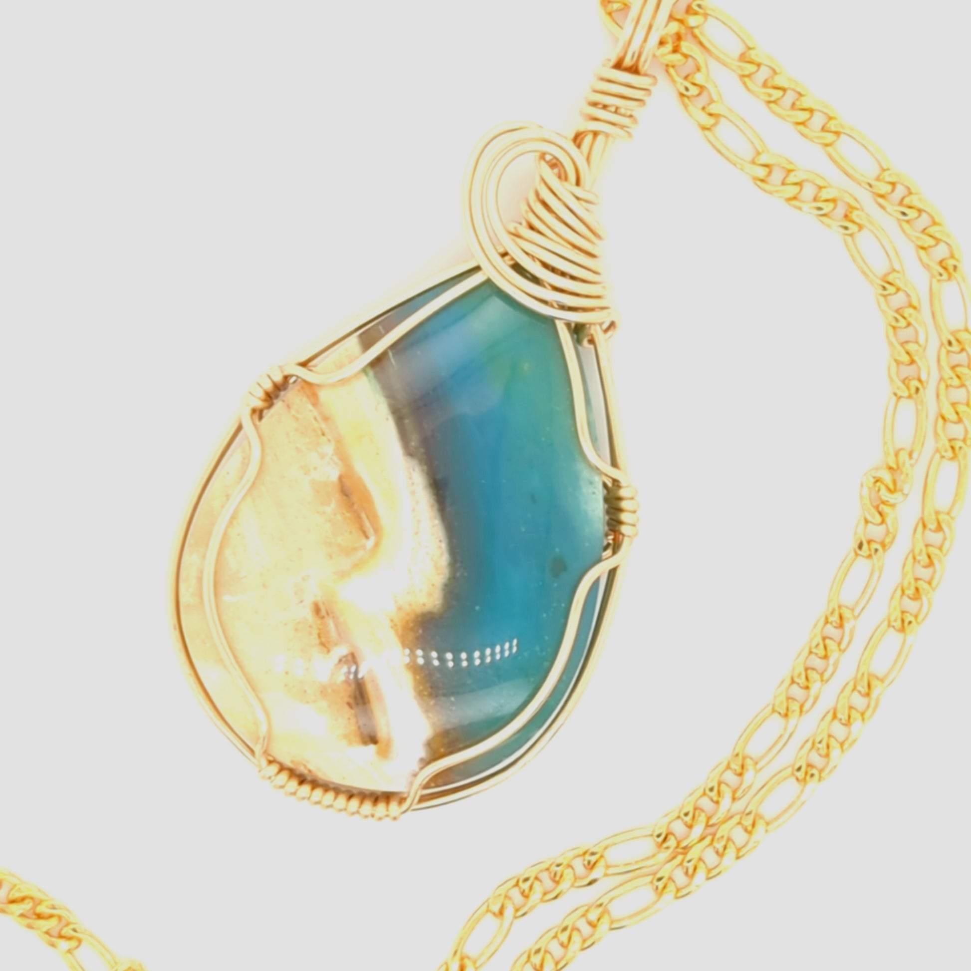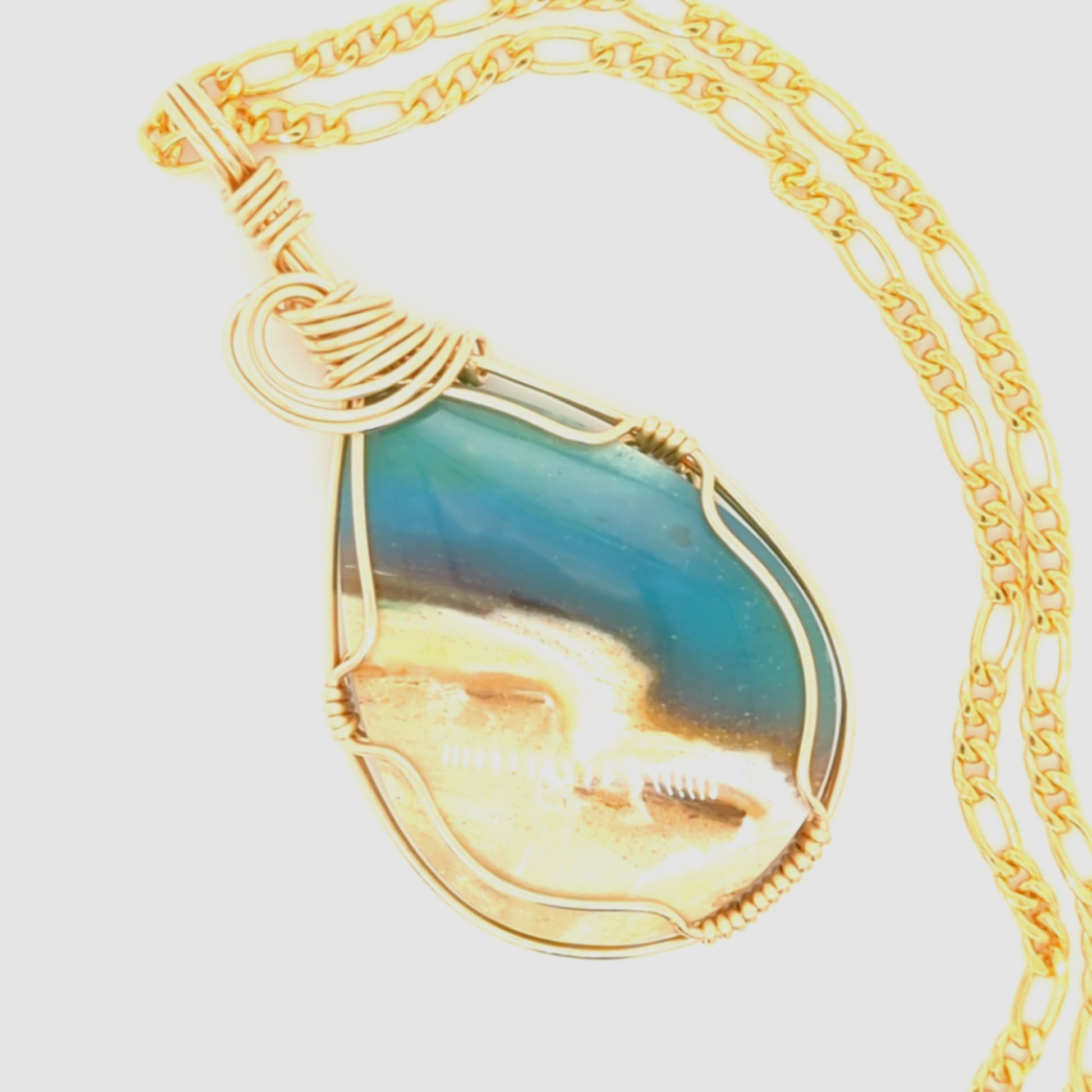 This Beach Opal Necklace features a large teardrop gemstone with a natural landscape shoreline design. The gorgeous handcrafted piece displays a cream sand and deep turquoise water, expertly wrapped in gold fill wire to let the gemstone be the focal point. . Hung on a thick, adjustable Figaro chain in 14kt Gold Fill that goes up to 18" length.