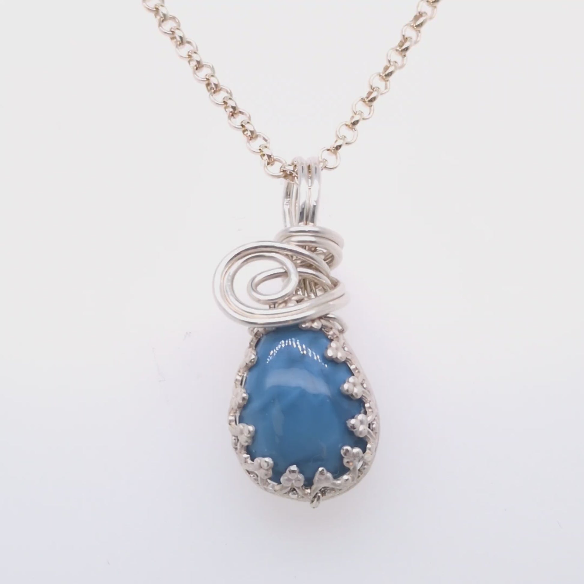 Sterling silver reversible mini pendant showcasing dual designs for versatile styling. One side features an inverted heart setting that cradles a striking denim blue gem, while the reverse displays intricate wire weaving for visual interest from every angle. The spiral-wrapped bail ensures secure, elegant suspension. This compact piece transitions seamlessly between casual and refined occasions, offering two distinct looks in one sophisticated accessory.