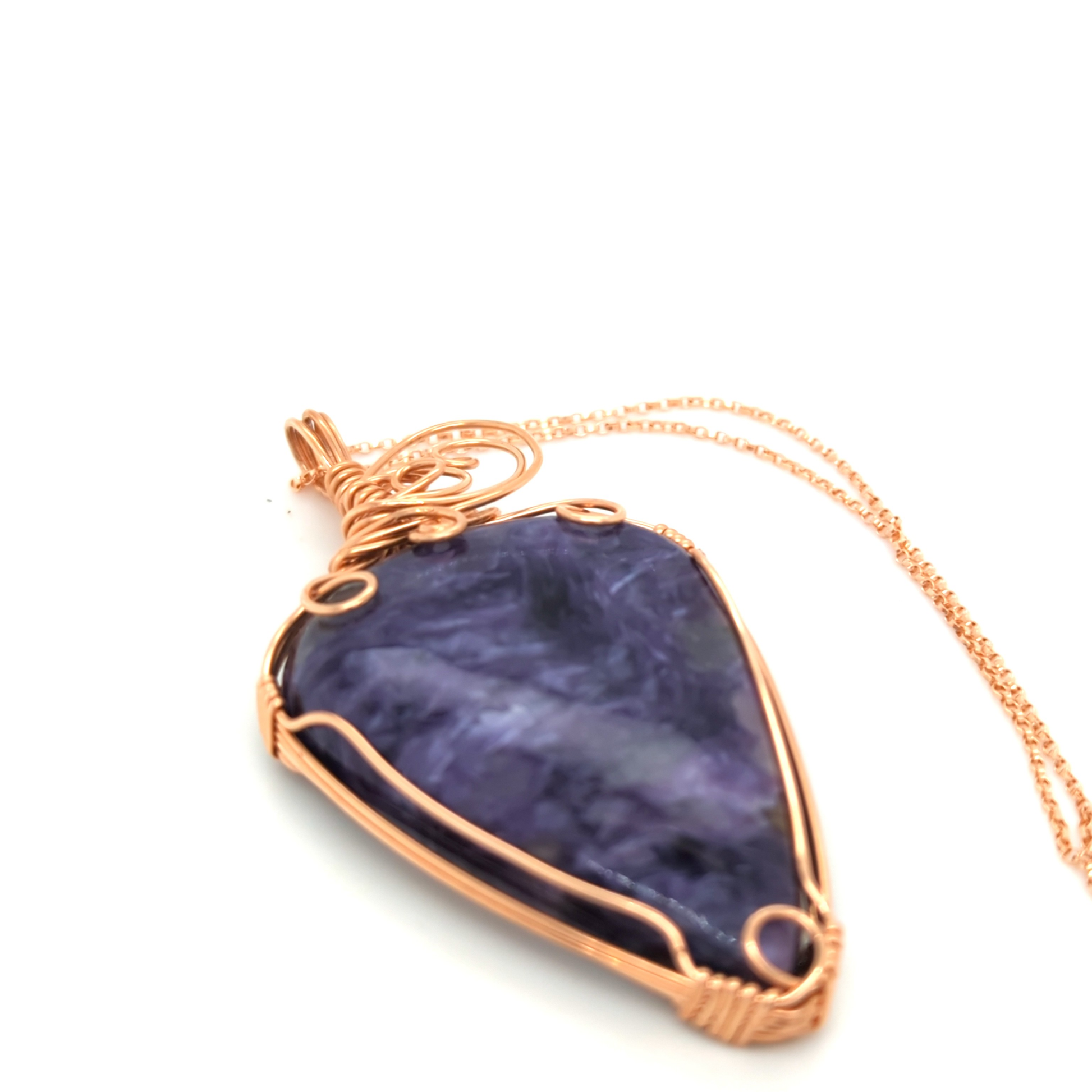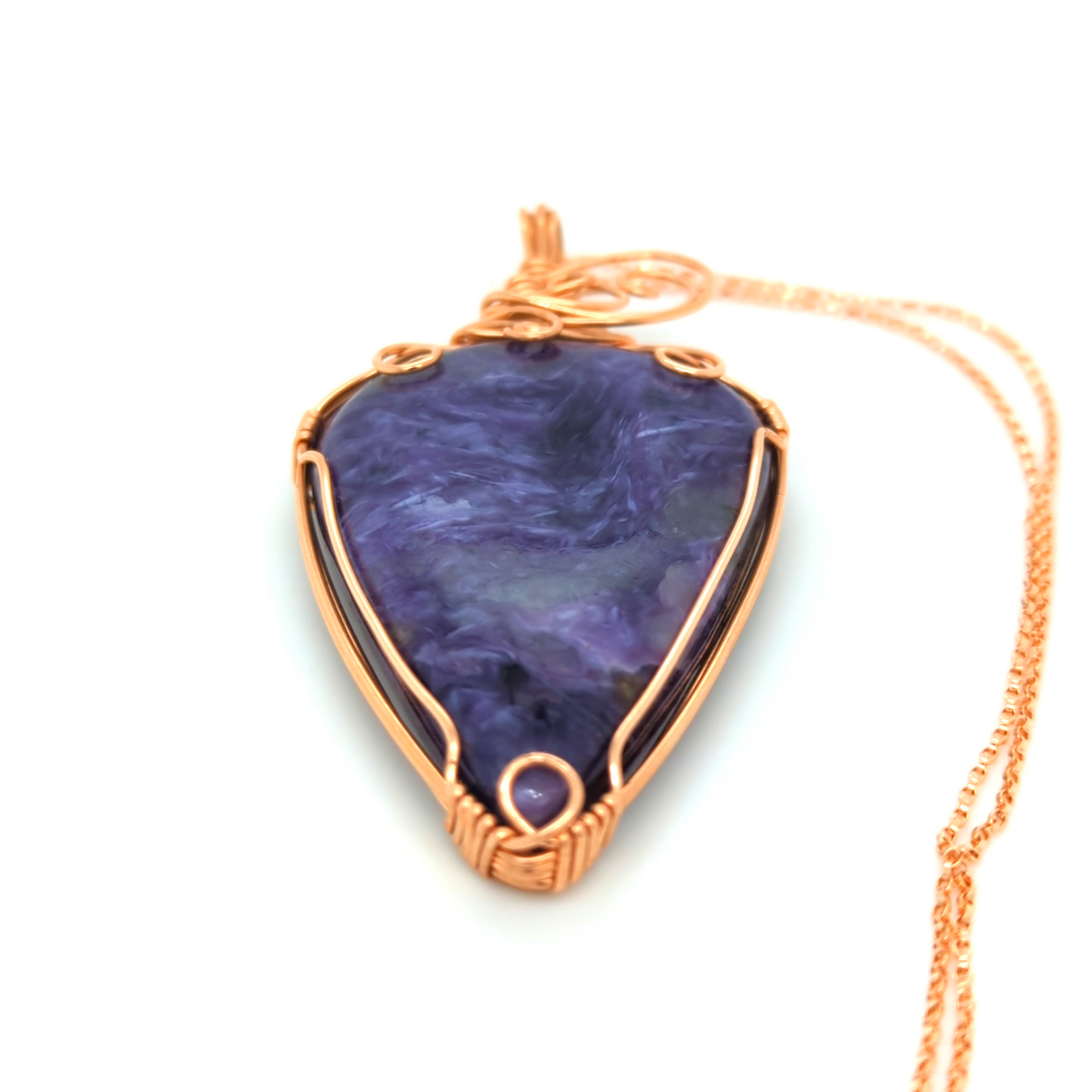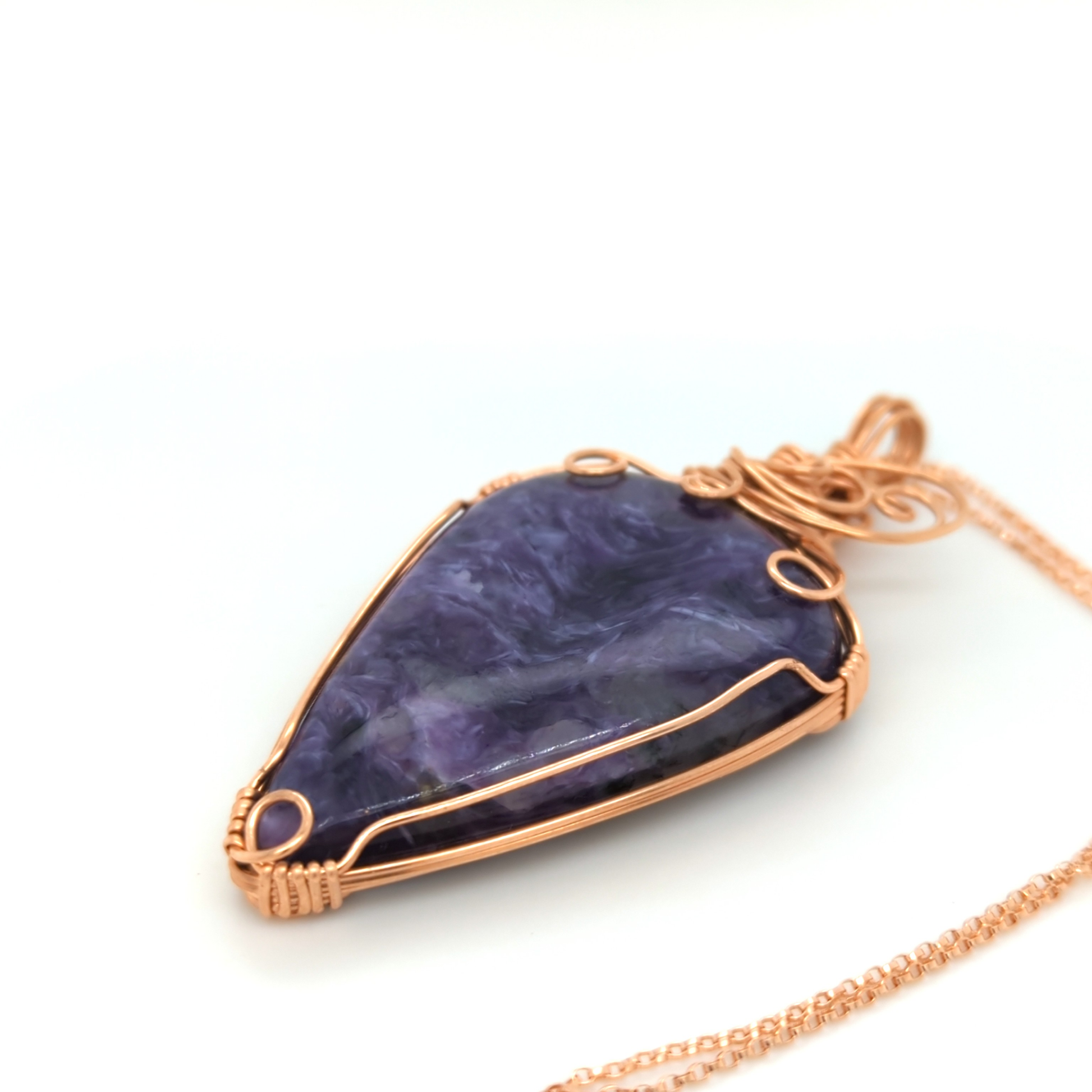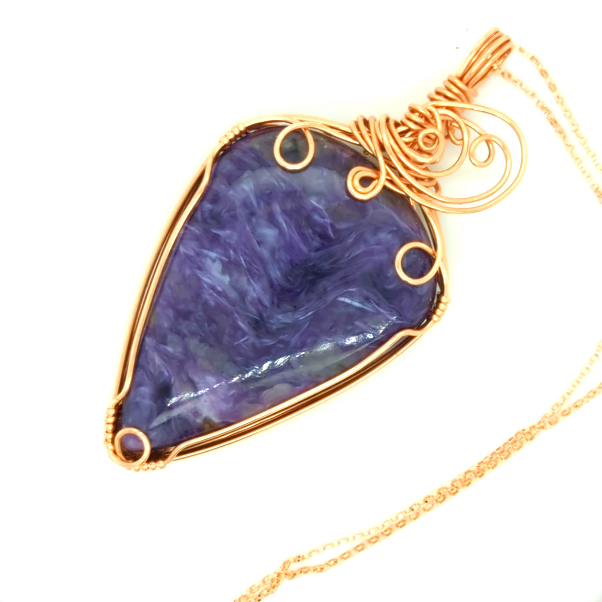 This Charoite Rose Gold handcrafted pendant necklace features a large grade AA gemstone of deep purple and silver flecks, encased in a Rose Gold Fill wire setting. An elegant spiral design accentuates its beauty, creating a stunning piece. 18" Box chain in 14kt Rose Gold Fill.