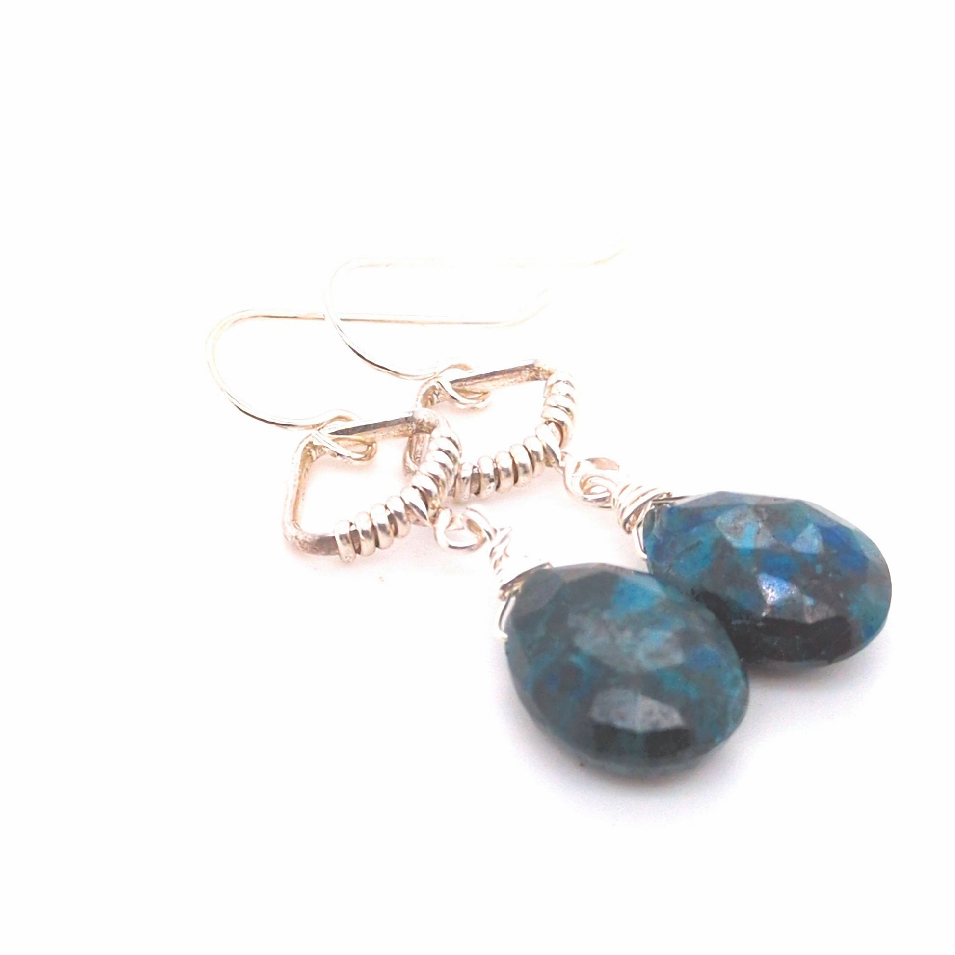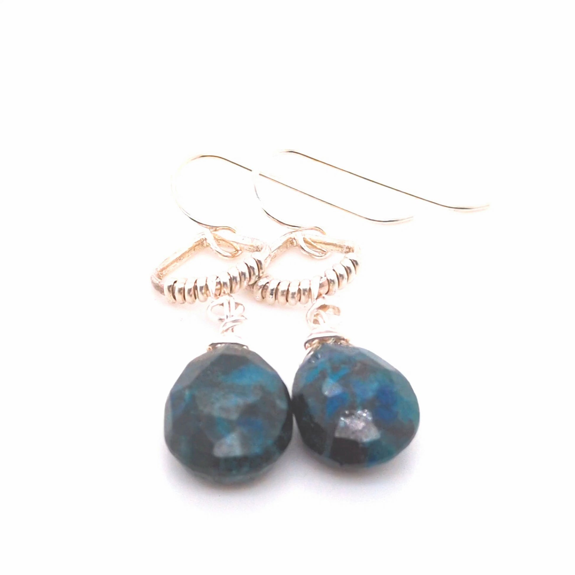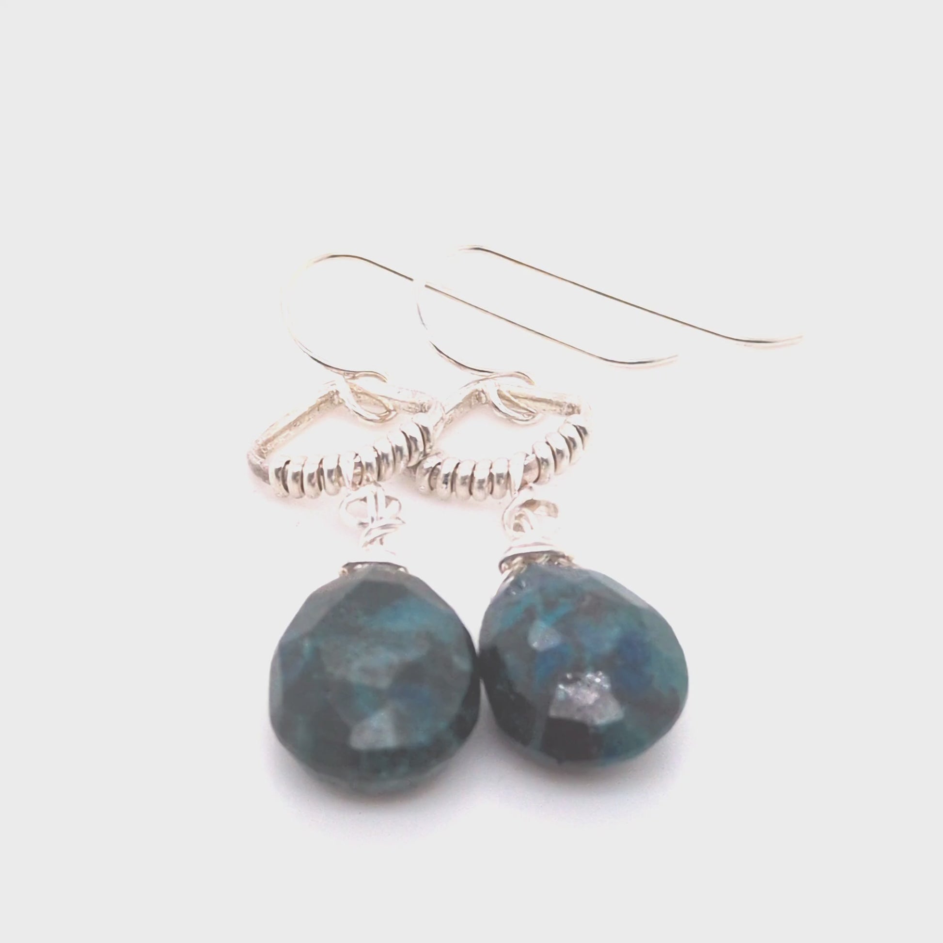 Discover the perfect blend of elegance and color with these sterling silver teardrop hoops, adorned with a dark teal faceted chrysocolla gemstone drop. Their unique design enhances your look with a touch of sophistication, making them an essential accessory for any wardrobe. Add a captivating sparkle that effortlessly transitions from day to night.