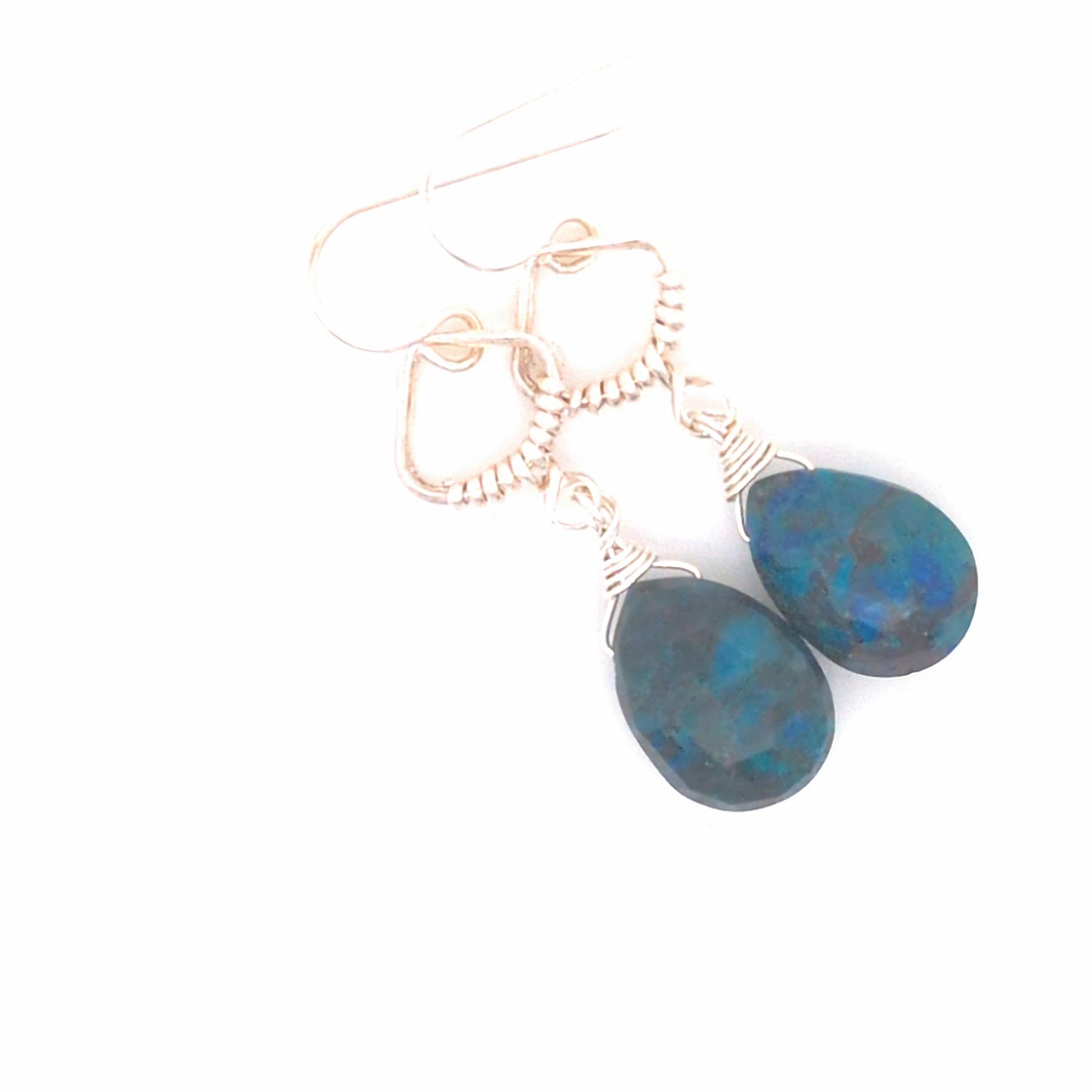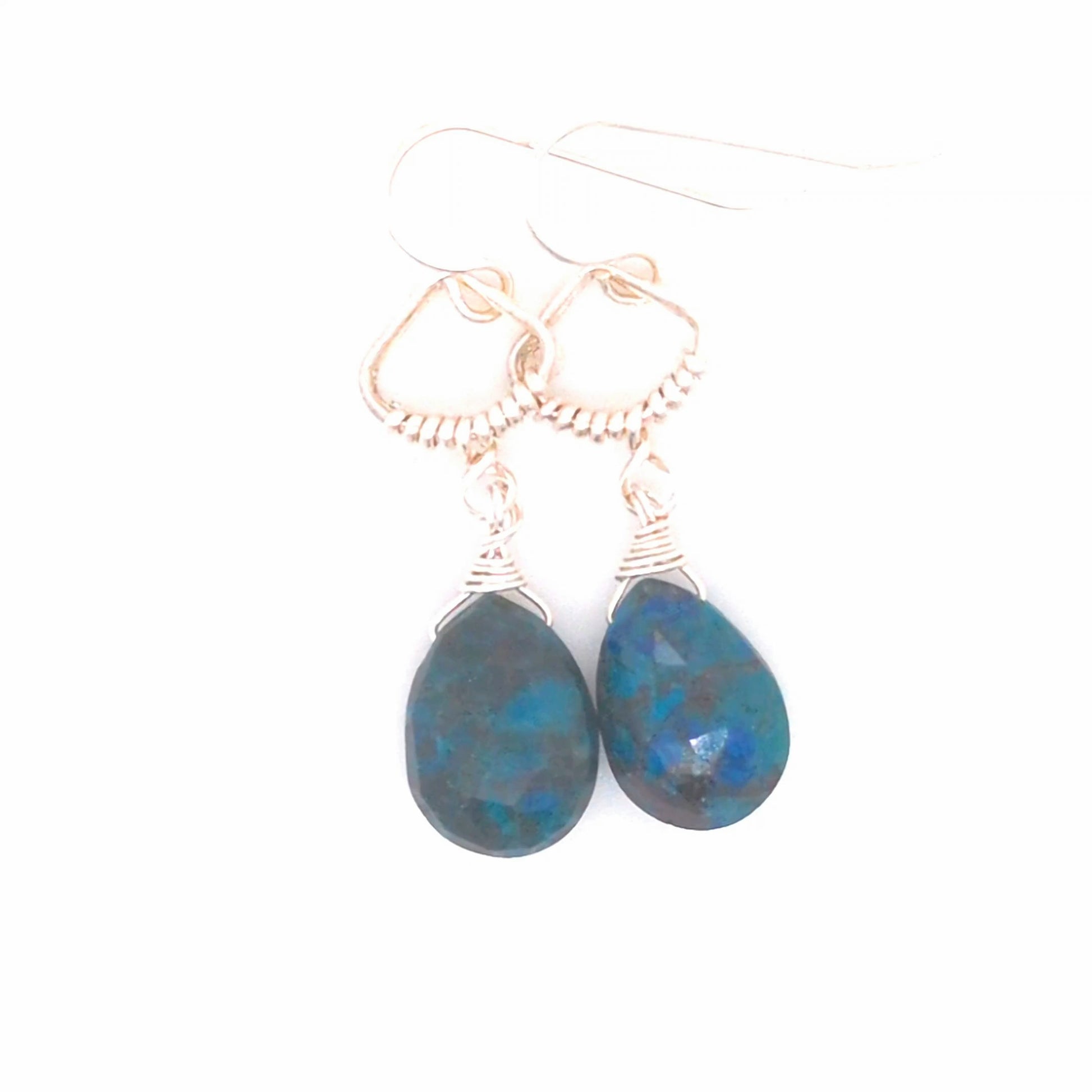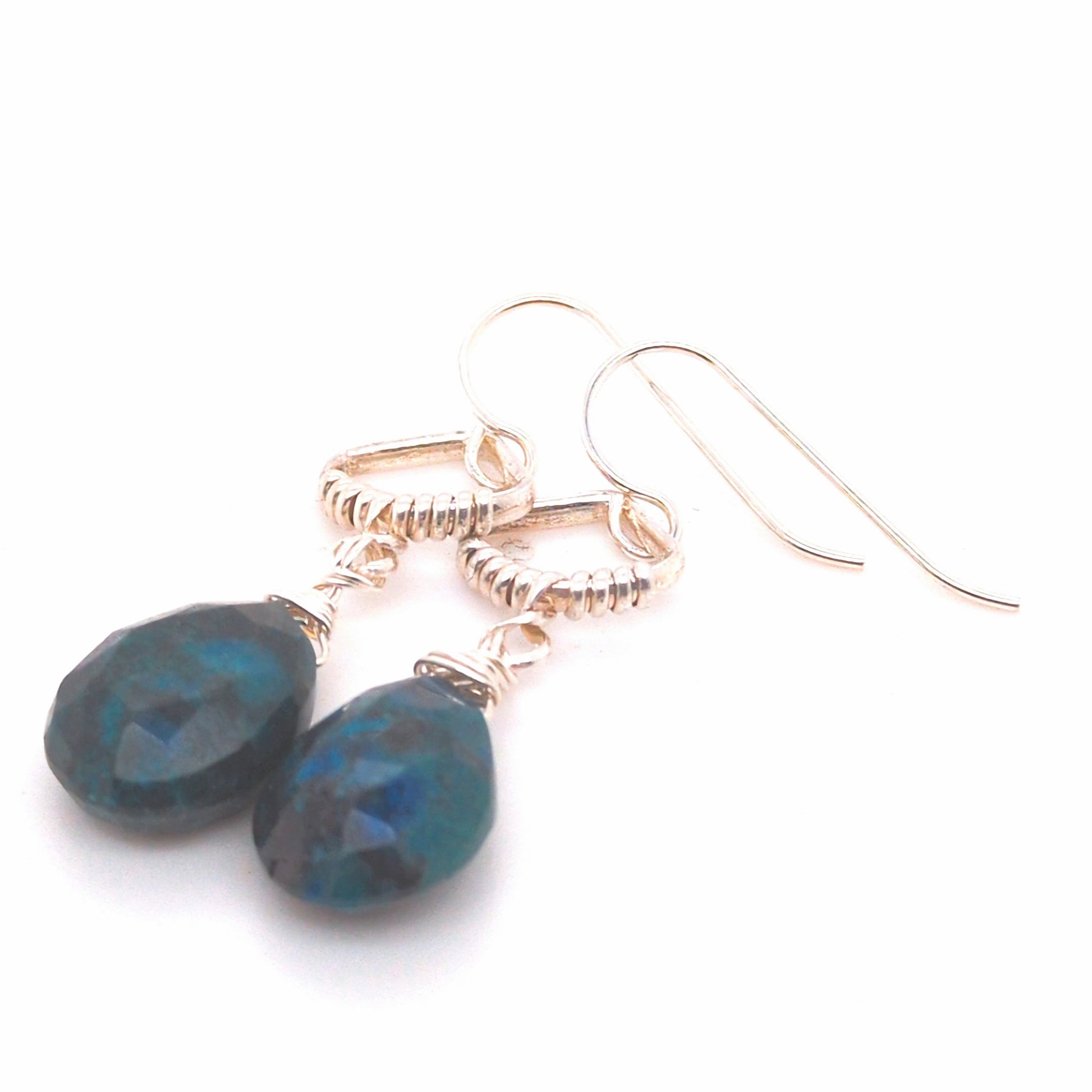 Discover the perfect blend of elegance and color with these sterling silver teardrop hoops, adorned with a dark teal faceted chrysocolla gemstone drop. Their unique design enhances your look with a touch of sophistication, making them an essential accessory for any wardrobe. Add a captivating sparkle that effortlessly transitions from day to night.