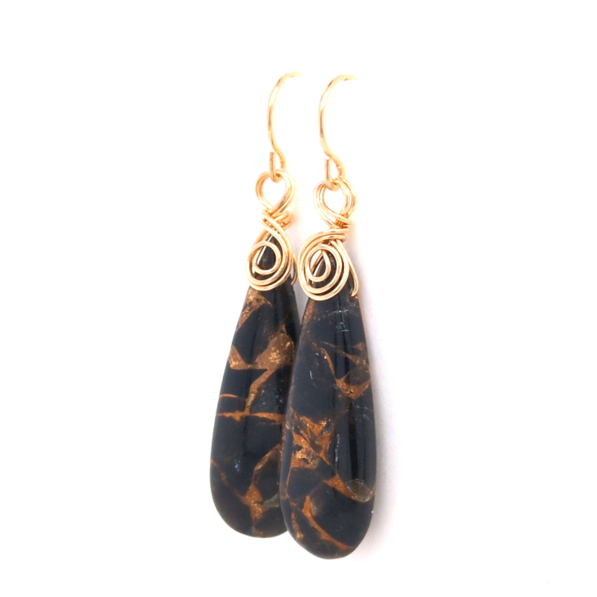 Add a touch of drama and elegance to any outfit with my Copper Obsidian Earrings! These stunning statement earrings are topped with a handcrafted spiral design that will catch the eye and add a unique touch to your look. Make a bold and confident statement with these one-of-a-kind earrings.