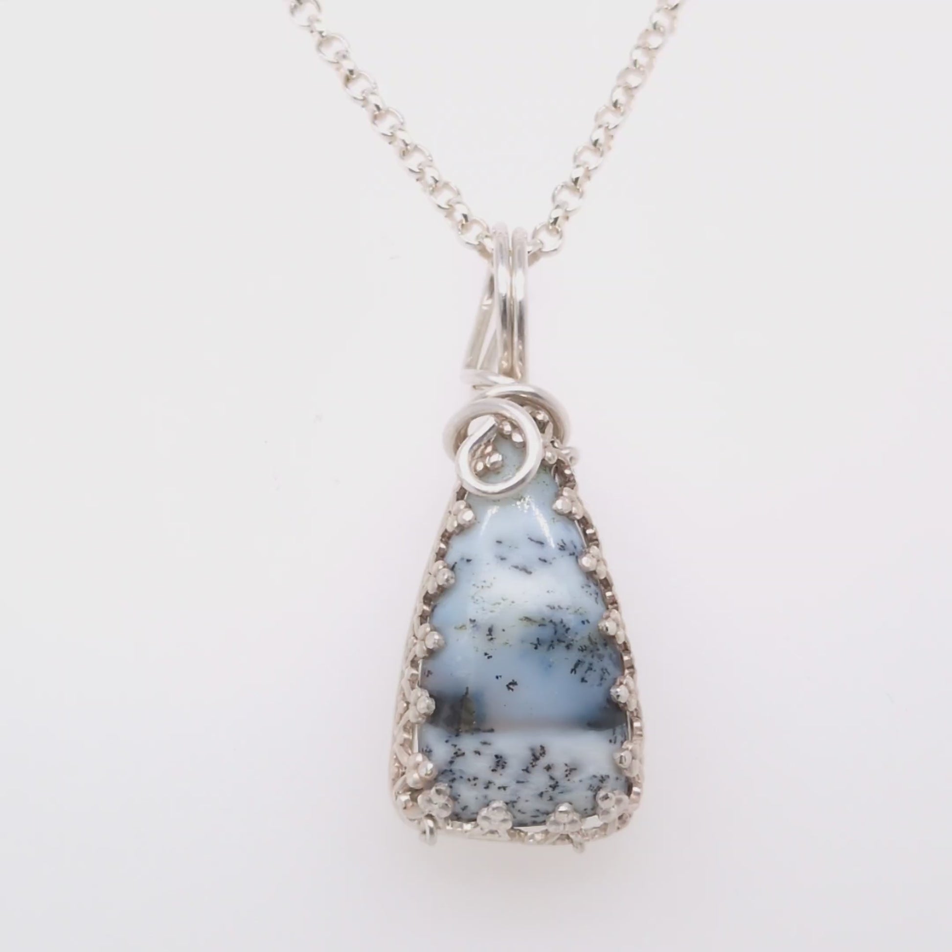 Dendrite Agate Pendant showcases striking black and white patterning in a versatile dual-design setting. One side features a traditional inverted heart frame with an elegant spiral crown, while the reverse displays an intricate wire-wrapped heart woven into the stone's back. This reversible design offers two distinct aesthetic expressions in a single piece, allowing you to present your preferred style depending on the occasion. The mixed metalwork techniques create visual depth and craftsmanship appeal, making this pendant a sophisticated addition to any collection.