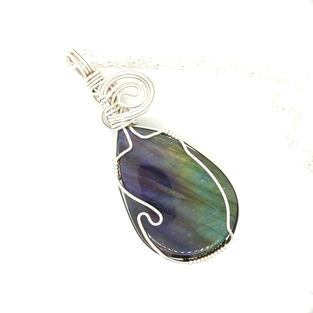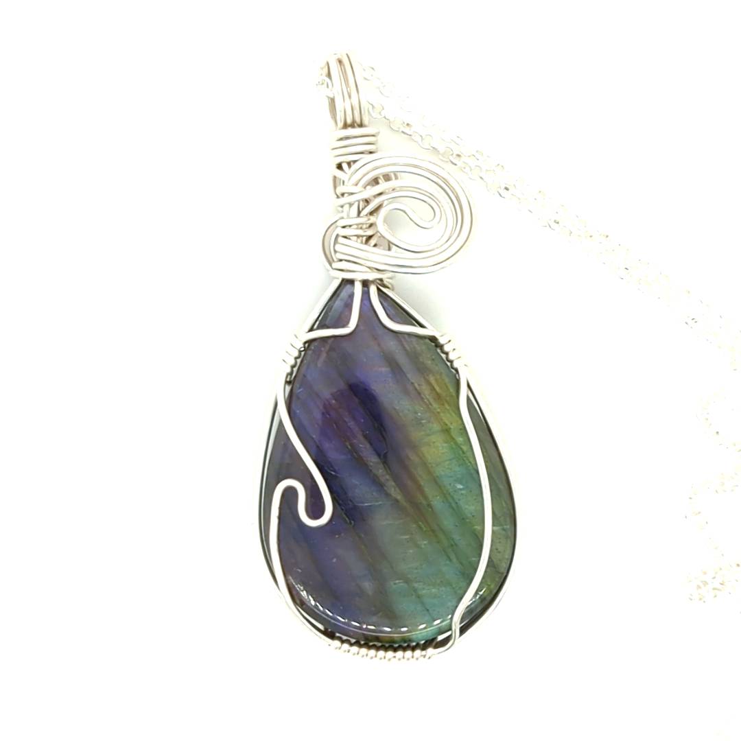 This large Labradorite Pendant showcases beautiful purple, turquoise, yellow, and green flashes, making it a stunning piece of jewelry. Its sterling silver wrapping features a unique wave pattern and is reversible for versatile wear. Elevate any outfit with this elegant and eye-catching pendant.