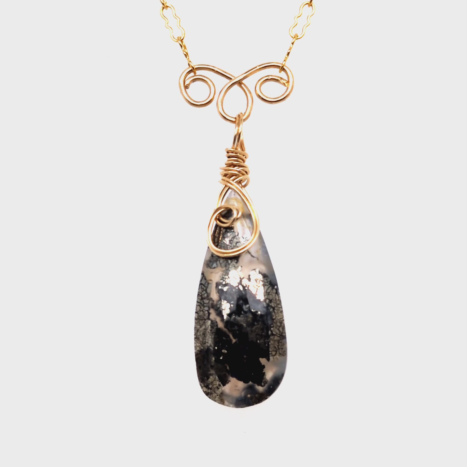 This elegant marcasite necklace showcases a natural gemstone with precise faceting that captures and reflects light beautifully. The stone is secured with an artisan spiral wrap design, while a handcrafted hook and eye clasp ensures secure fastening The textured 17" crinkle chain adds visual interest and complements the geometric sparkle of the faceted marcasite, making it a versatile piece for both everyday wear and special occasions.