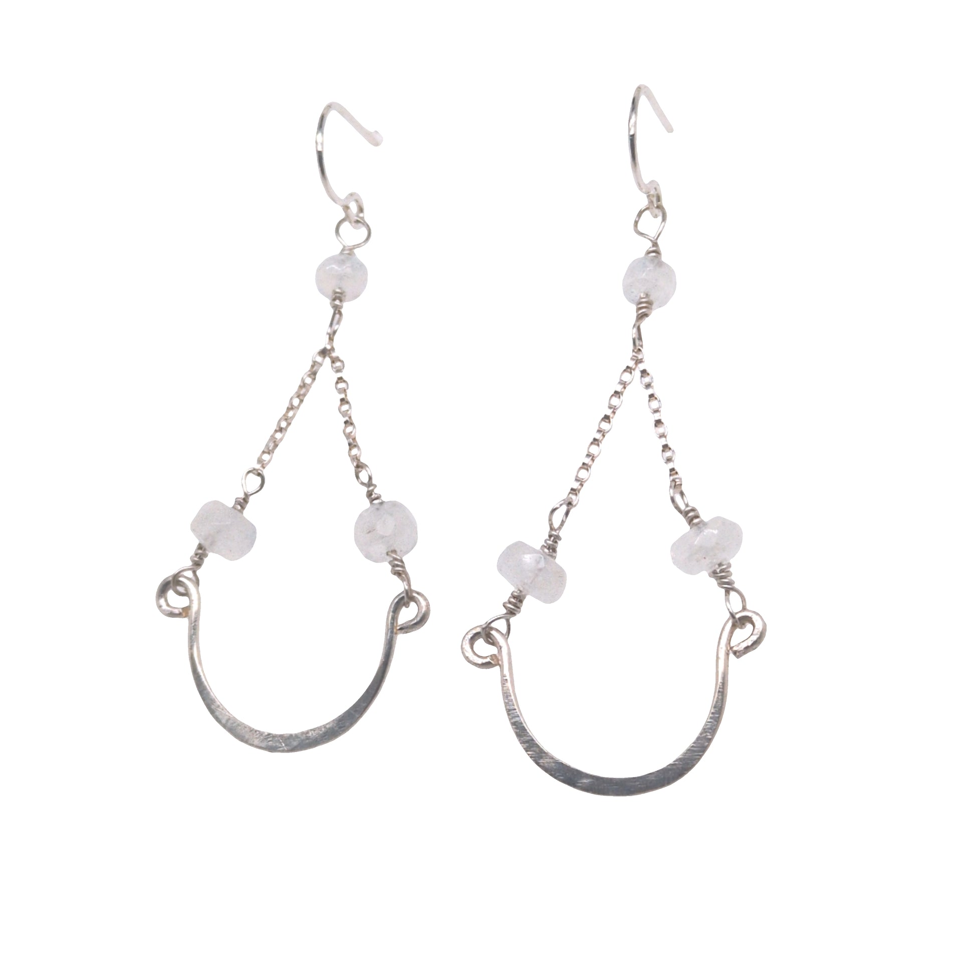 Expertly crafted with faceted white moonstone beads, these chandelier earrings feature an understated half-hoop silhouette that maximizes movement and light play. The suspended design allows stones to swing freely, creating dynamic sparkle with every turn of the head. At 1 5/8" in length and 7/8" in width, they deliver sophisticated presence without weight. An ideal choice for those seeking refined elegance with subtle luminosity.