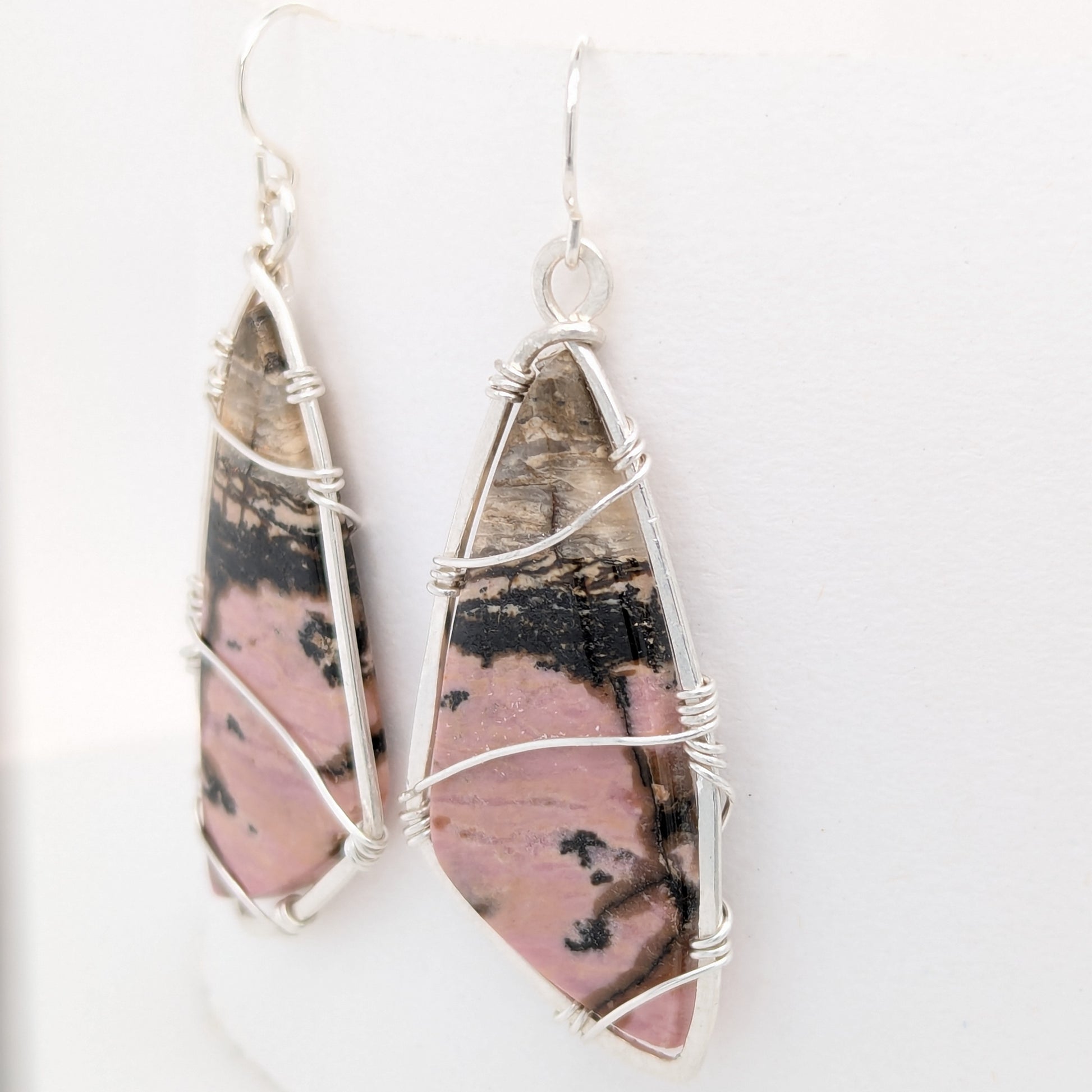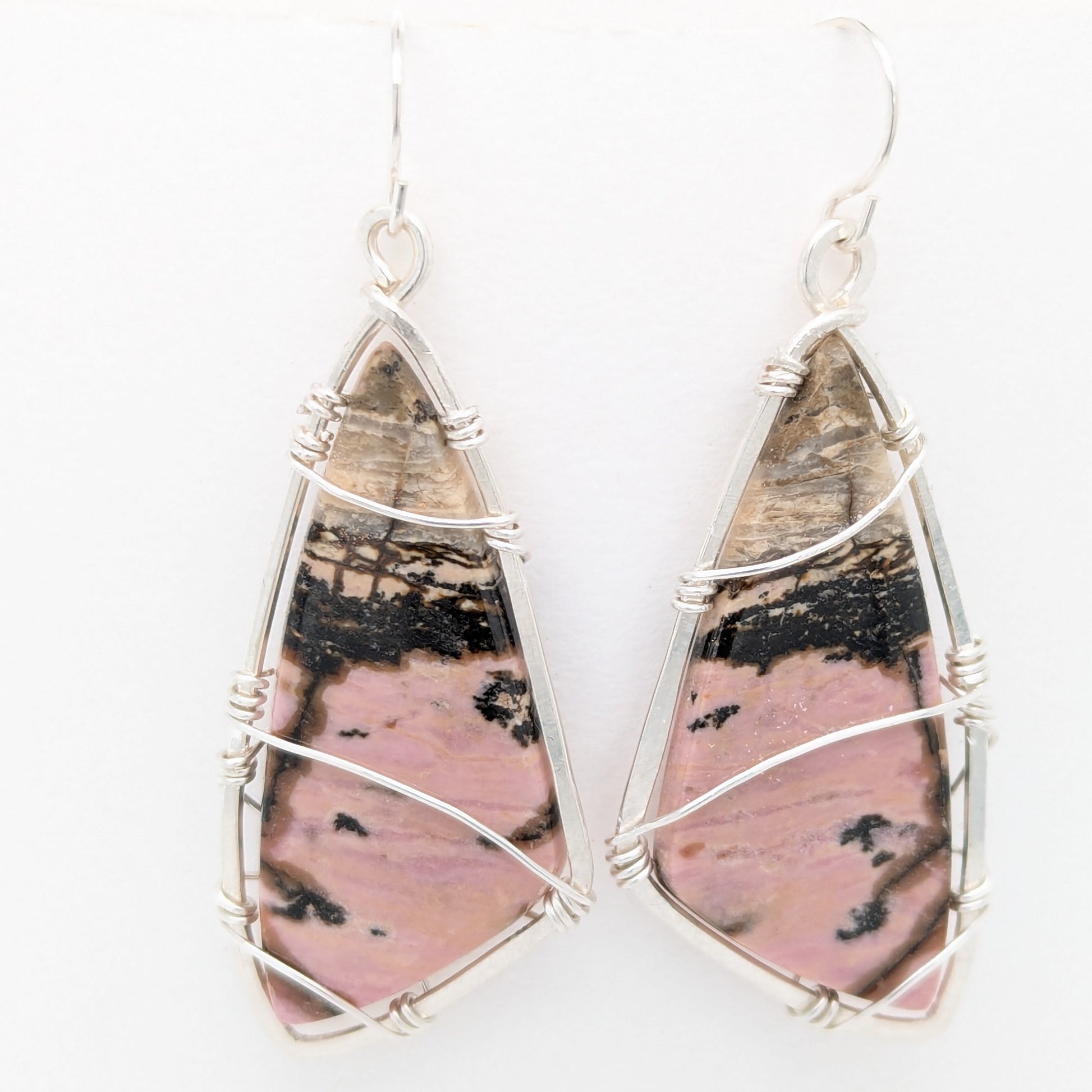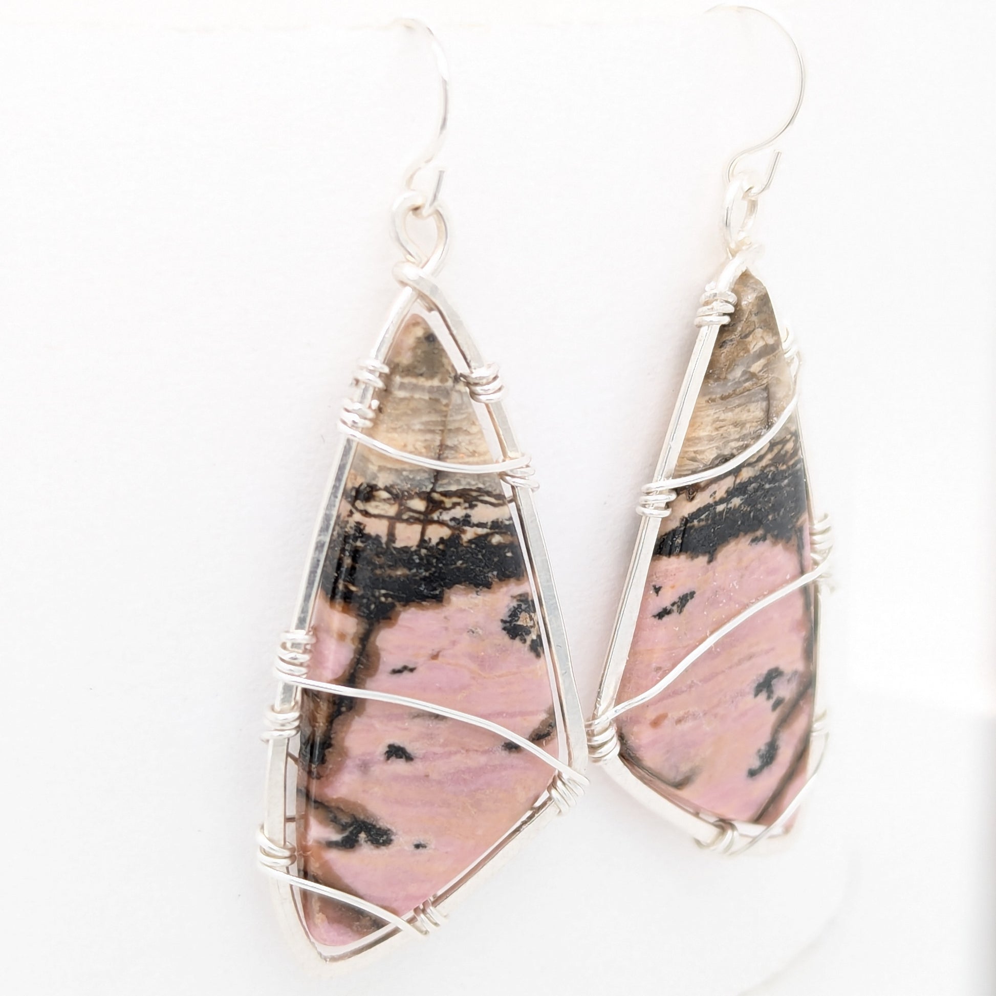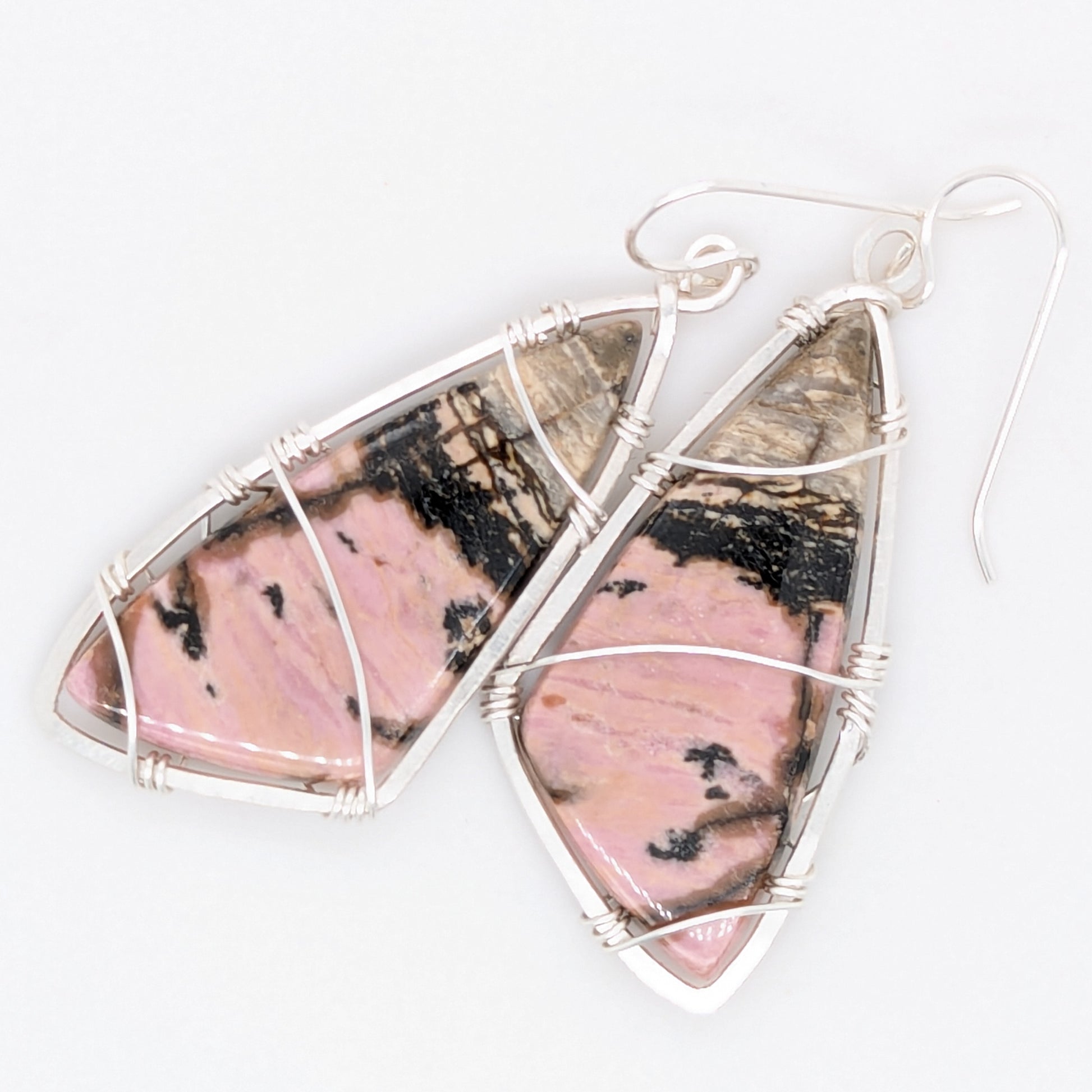 Radiate elegance and grace with my Rhodonite Earrings. Each natural stone is imbued with exquisite markings, shaped like butterfly wings and set in sterling silver frames. The simple, clean design allows the gems to take center stage, making these earrings a must-have for any fashion-forward individual.