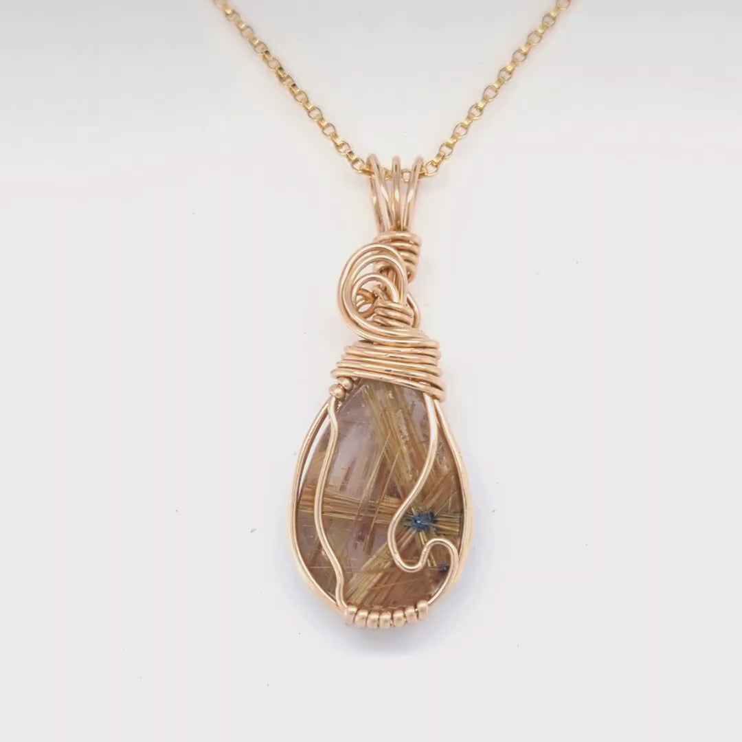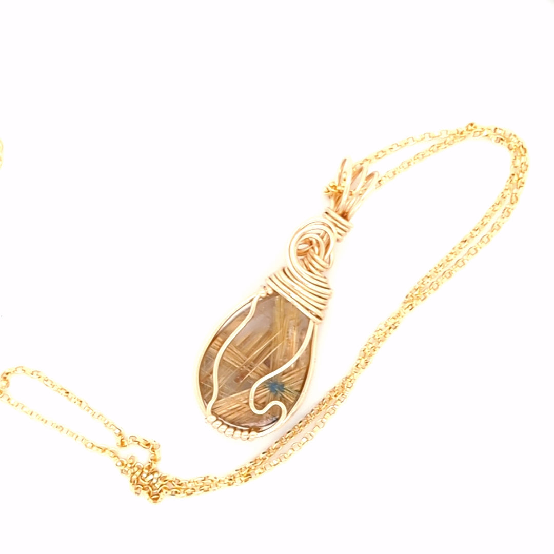 Adorn yourself with the unique beauty of nature with this Star Rutile Pendant. Crafted from a natural rutile star gemstone within quartz, this piece of jewelry is wrapped with 14kt gold fill and detailed with wave and spiral designs. A perfect choice for any occasion!