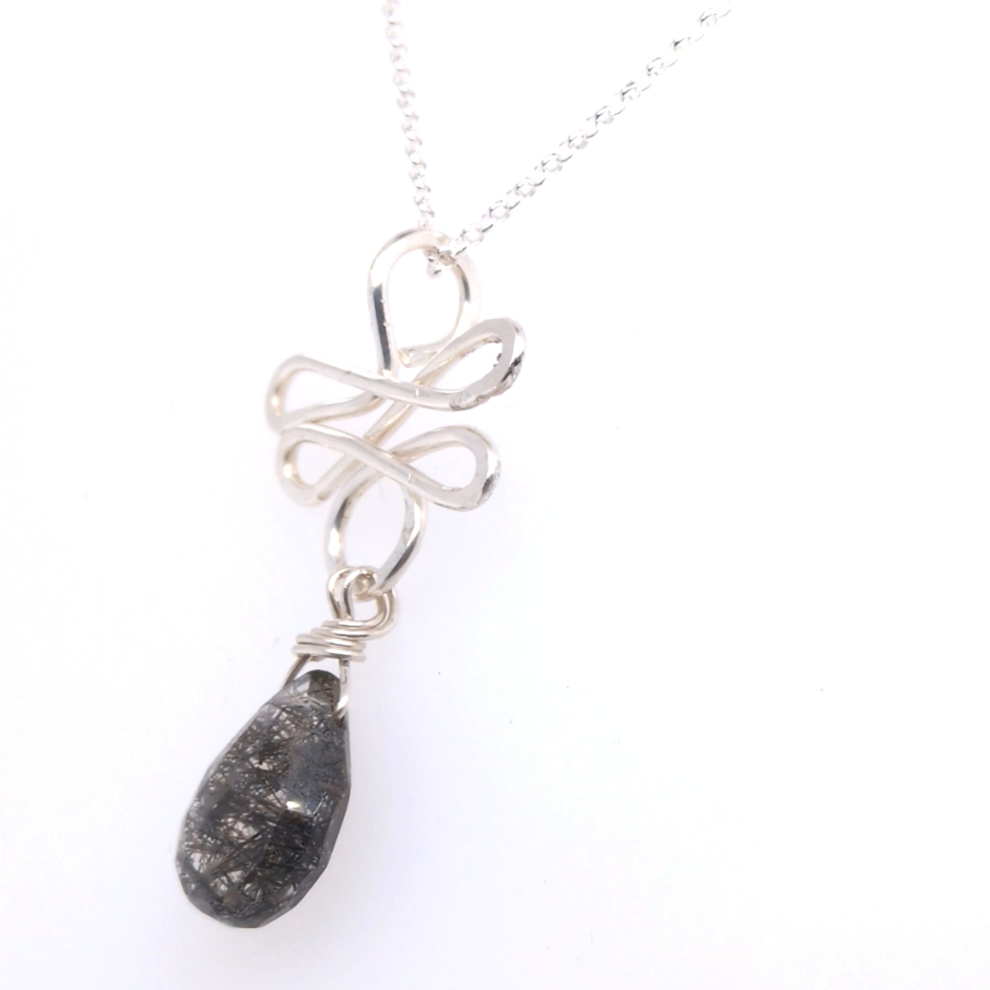 A striking faceted clear gem showcases natural black striations that catch the light beautifully. The stone is suspended from a handcrafted sterling silver spiral setting that frames the pendant with elegant movement. This pendant celebrates the raw beauty of tourmaline quartz, with the artisan-made metalwork adding a distinctive touch. Perfect for those who appreciate natural gemstones and thoughtful jewelry design.