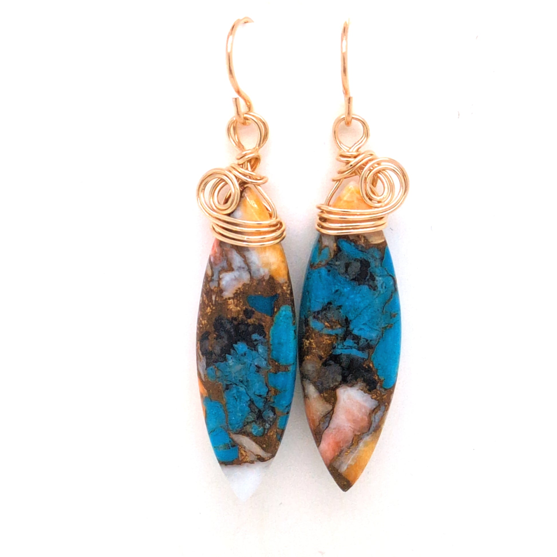 Discover the captivating beauty of Turquoise Spiny Oyster Earrings! The hand formed spiral top design highlights the gemstones' stunning blend of turquoise, orange and white with copper veining. A perfect accessory to elevate any outfit. Add a touch of elegance and uniqueness to your style today!