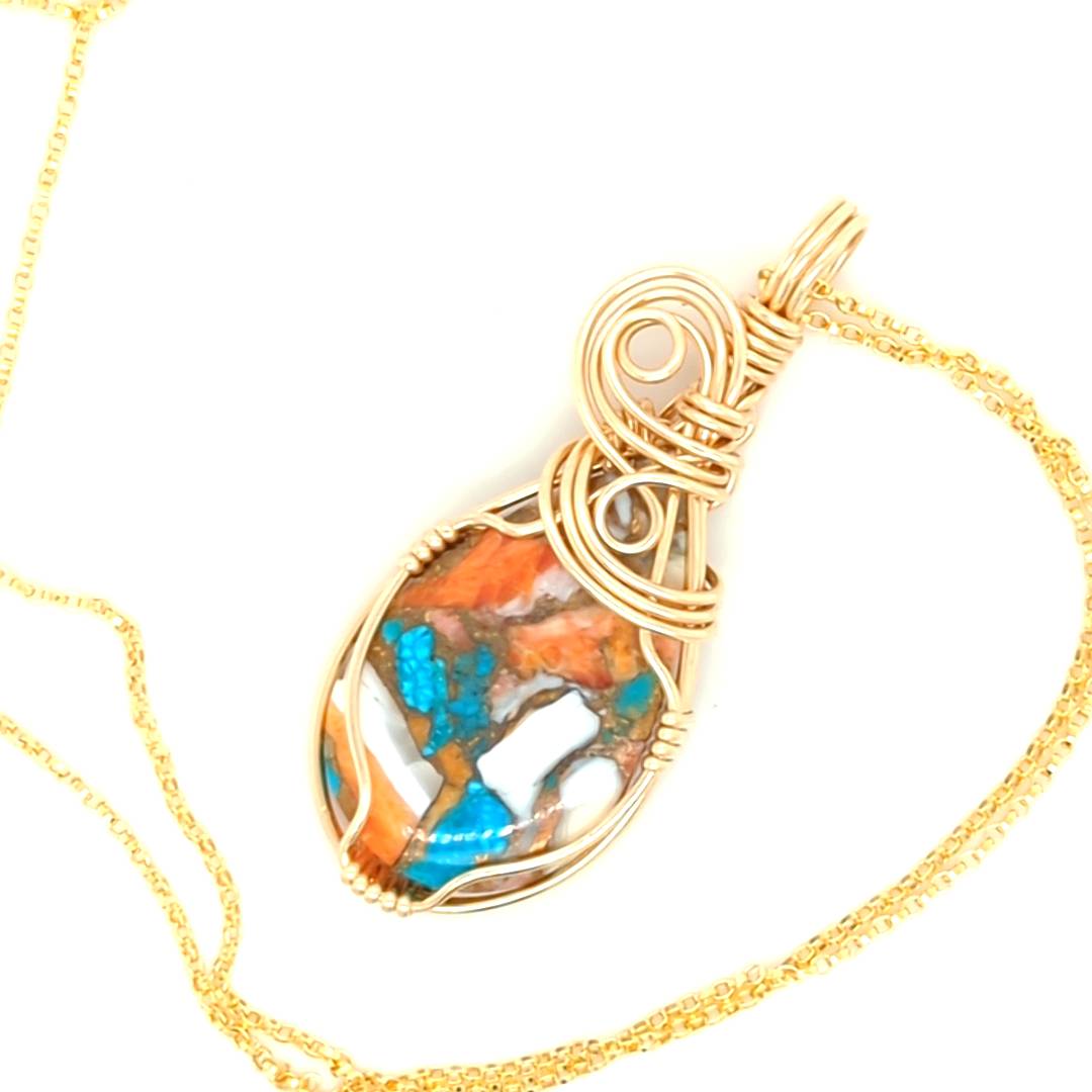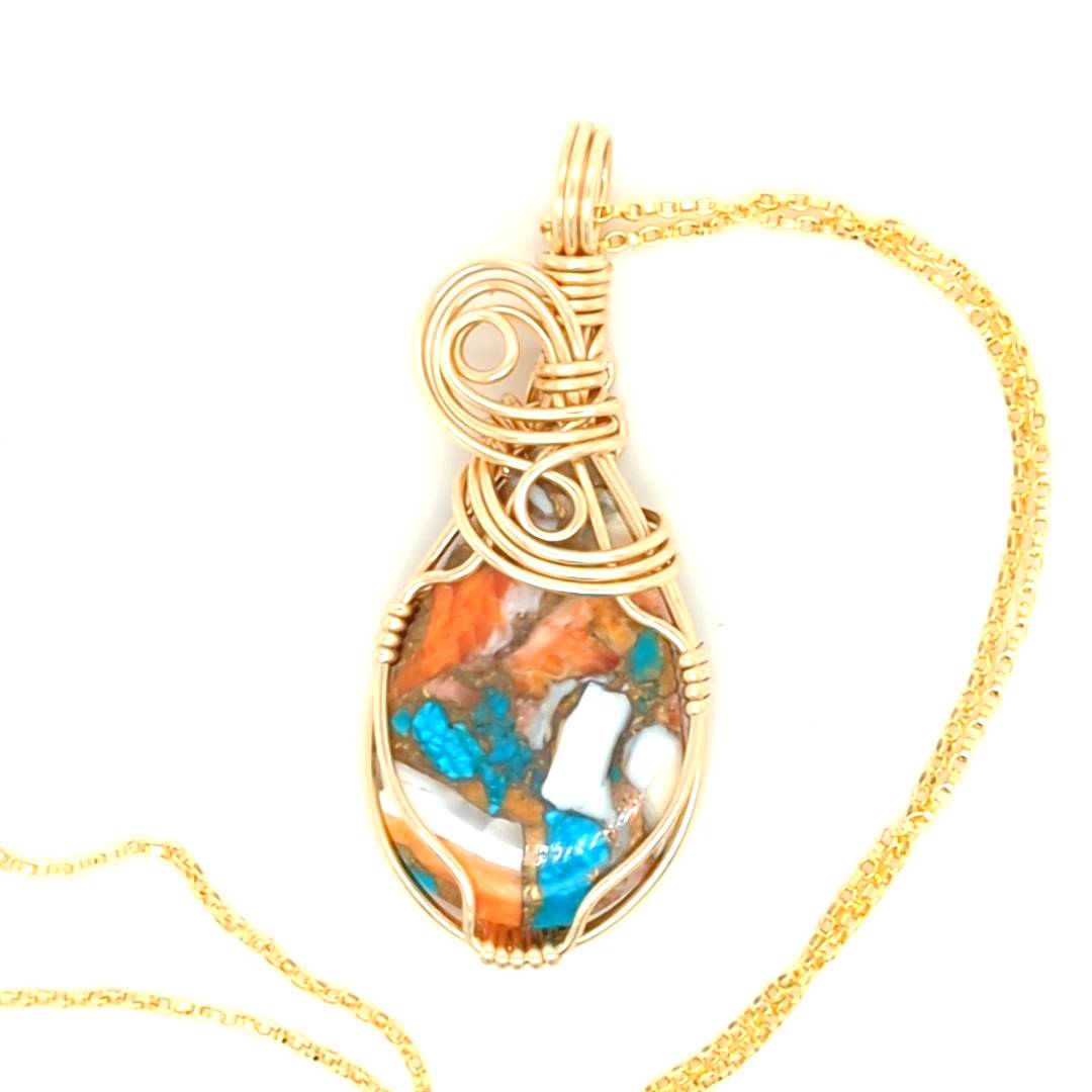 This beautifully crafted pendant features a unique combination of spiny oyster, turquoise, and copper wire wrapped in gold with elegant spiral accents. The vibrant colors and intricate design make for a stunning statement piece. Add a touch of nature and sophistication to any outfit with this one-of-a-kind pendant.
